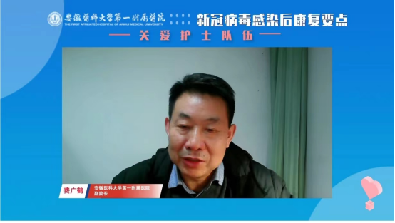 副院长费广鹤向护理工作者介绍了奥密克戎病毒的特点、新冠病毒感染后的典型症状和临床表现,并详细分享了新冠病毒感染后相应症状的临床用药和康复要点。他十分关心医院护士队伍,对一线护士表达了亲切的问候,指导大家康复期可根据后遗症状的轻重进行必要的治疗,并就如何进行合理的饮食、适当的锻炼、充足的睡眠进行授课,同时强调了保持乐观心态的重要性。