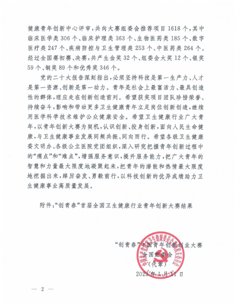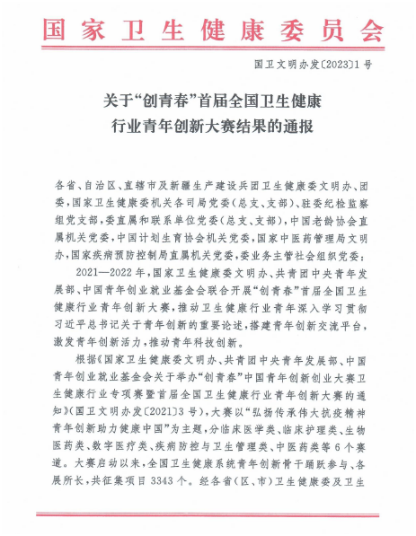 据悉,“创青春”首届全国卫生健康行业青年创新大赛以“弘扬传承伟大抗疫精神 青年创新助力健康中国”为主题,分为临床医学类、临床护理类、生物医药类、数字医疗类、疾病防控与卫生管理类、中医药类等6个赛道。在全国卫生健康系统上报的3343个项目中,经过全国赛初赛、决赛,共产生金奖32个、组委会大奖12个、银奖59个、铜奖89个和优秀奖346个。 党的二十大报告深刻指出,必须坚持科技是第一生产力、人才是第一资源、创新是第一动力。青年是社会上最富活力、最具创造性的群体,理应走在创新创造前列。在此次创新大赛中获奖,充分彰显了安医大一附院青年医护员工的创新意识与创新能力。希望全院青年以获奖的优秀青年和团队为榜样,以国家需求为使命担当,以医院发展为内驱动力,始终坚持“追求卓越、敢为人先”的创新精神,踔厉奋发、激发潜能,面向人民生命健康推动技术创新,切实解决医疗健康卫生事业发展中的“卡脖子”问题,用新时代青年的智慧和汗水,为医院争创国家医学中心、国家区域医疗中心添砖加瓦,为建设“健康中国”贡献青春力量。