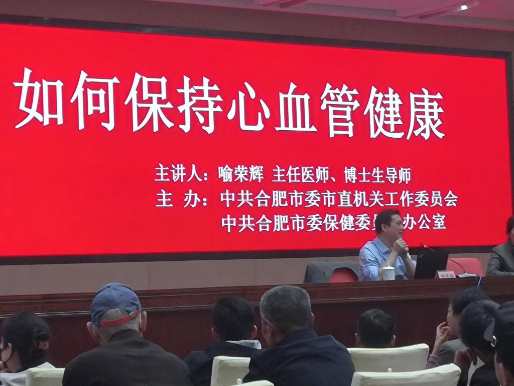 为引导广大机关干部自觉养成健康生活方式,在日常生活中做好自我保健与疾病预防,4月10日下午,由中共合肥市委直机关工作委员会及中共合肥市委保健委员会办公室主办的“健康大讲堂”——《如何保持心血管健康》讲座于合肥市政务中心二楼会议室举行,我院院长助理喻荣辉应邀作为主讲人。