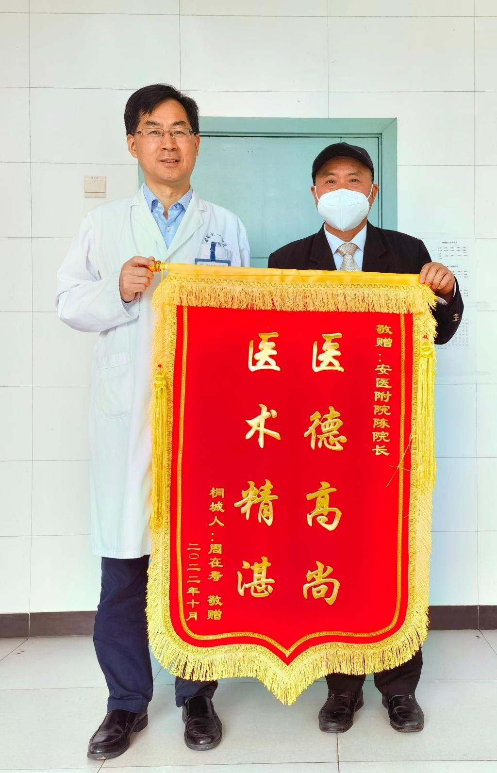 “这封感谢信晚了六十年,感谢安医给了我第二次生命!”5月11日上午,来自桐城的周先生带来了一面红绸缎制成的感谢信,亲手交到了八十余岁的烧伤科老专家李守生手中。两双手紧紧握在一起,跨越了一个甲子的再次相见让周先生热泪盈眶。