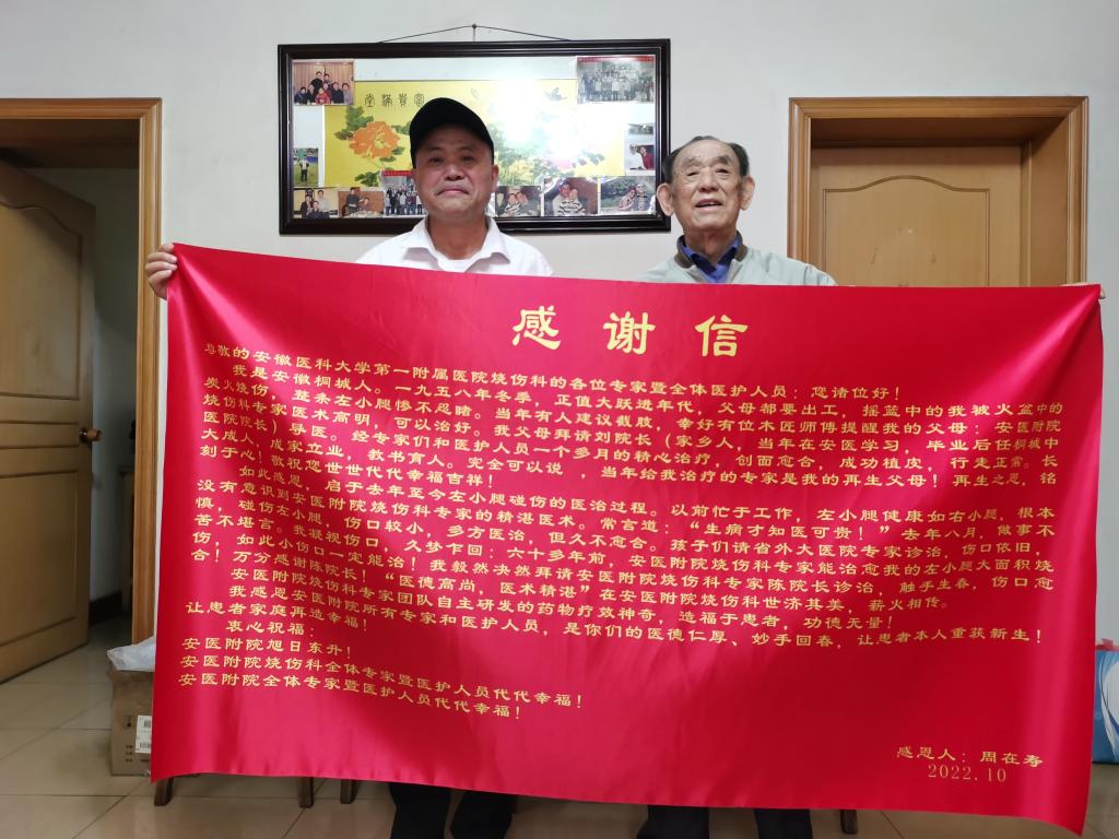 1958年,当时只有2岁的周先生独自在家,不慎打翻了取暖的炭火盆,导致左腿大面积烧伤。碍于当时的通讯和交通的不便,1961年,周先生的父母辗转带他来到安徽医科大学第一附属医院(时为安徽医学院附属医院),寻求治疗。当时,医院负责诊治烧伤患者的陈国钧、李守生两位专家,为他进行了植皮手术。六十多年来,周先生如常人一样,行动自如,成家立业,生活幸福。