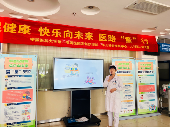 在儿科门诊和儿科输液厅,医护人员在向小朋友们赠送节日礼物、祝福节日快乐的同时,还进行了线上和线下的健康科普活动,向家长讲解了儿童自闭症和缺陷多动障碍的相关知识,呼吁更多的人可以关心关爱这群小天使,并演示了海姆立克急救法,直播线上观看人达1500余人次,受到家长的热烈欢迎。