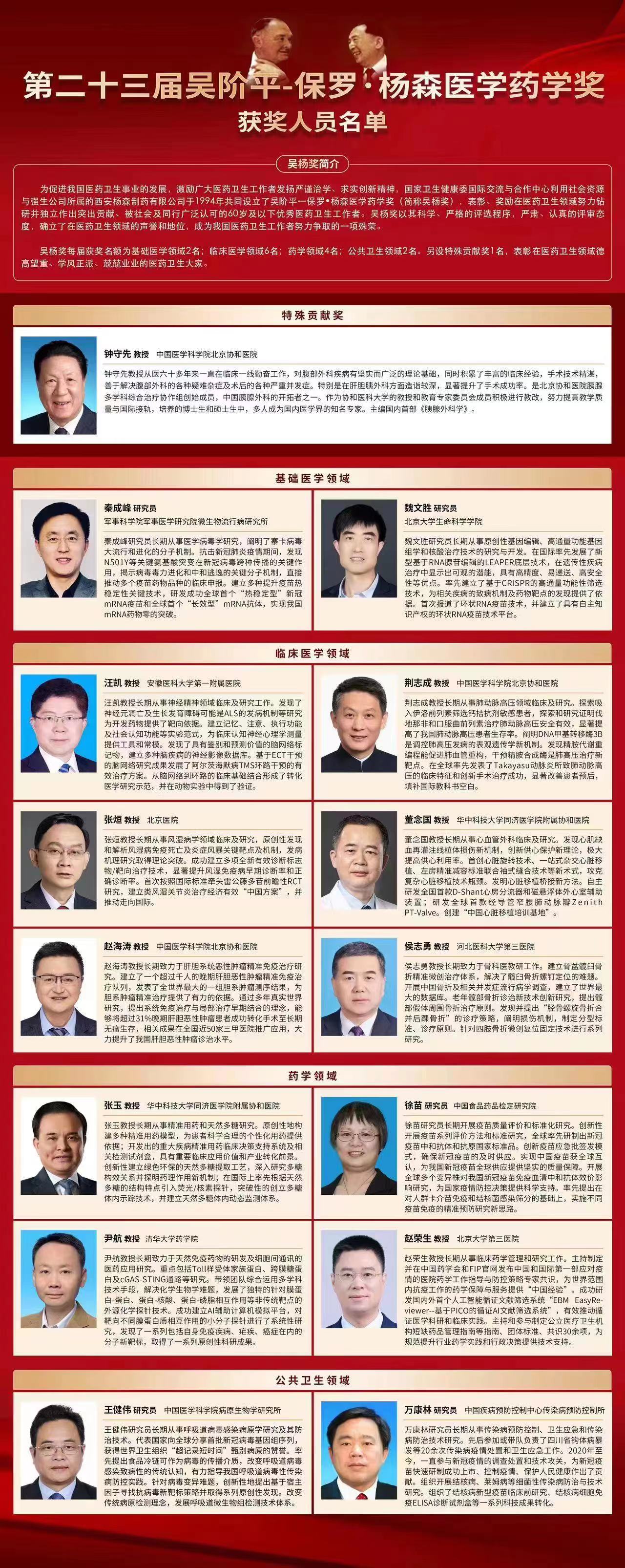 据悉,吴杨奖于1994年经科技部奖励办批准设立,旨在表彰、奖励在医药卫生领域努力钻研并作出突出贡献、被社会及同行广泛认可的优秀中青年医药卫生工作者,秘书处设立在国家卫生健康委国际交流与合作中心。吴杨奖以其科学、严格的评选程序,严肃、认真的评审态度,确立了其在医药卫生领域的荣誉和地位,成为我国医药卫生工作者努力争取的一项殊荣。