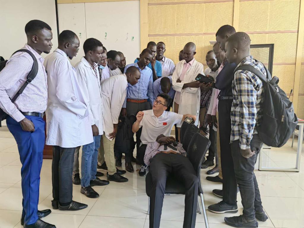 在竭尽所能提供合理诊疗方案的同时,医疗队员们也认识到,帮助当地医生快速成长,才能更有效地帮助当地人民。于是,针对ICU的工作需要,他们开展了《重症监护室脓毒症和多器官功能衰竭患者的管理》《ICU抗生素应用原则》《感染性休克的治疗》《血流动力学的基本原理和监测》《呼吸机的基本原理》等十余次理论知识讲座,收到了极佳的教学效果。从开始面对ICU的医生教学,到后来内科、麻醉科、手术室等多个科室的医生慕名前来学习。他们还克服了模拟人等培训设施紧缺的困难,充分利用现有条件,开展了“超声引导下中心静脉穿刺置管术”“气管插管术”“呼吸机参数设置和调整”等多次临床技能培训。“你们的授课生动、精彩,我们学到了很多有用的知识和技能,对我们帮助很大。非常感谢中国医疗队!”ICU主任劳特如是说。