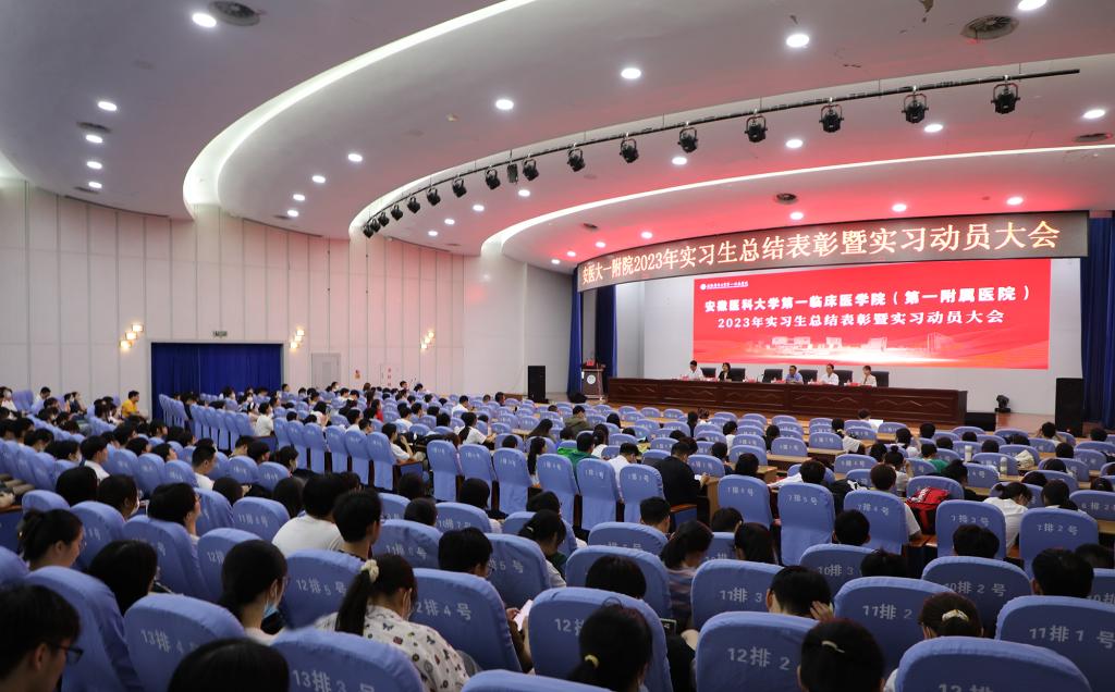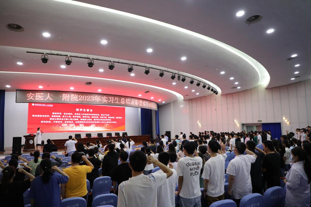 会上,孙民宣读了《安徽医科大学第一附属医院关于表彰2023年度优秀实习生、优秀实习队长的通知》,主席台领导给优秀实习生、优秀实习队长颁发荣誉证书,优秀实习生代表李文昊就实习收获、临床教学教师代表普外科陈博医师就实习目标与要求,分别上台分享个人心得体会。许敏带领实习生重温医学生誓言,现场气氛热烈,同学们精神昂扬。