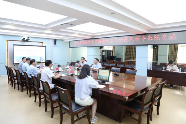 6月29日上午,首都医科大学附属北京天坛医院党委书记管仲军、中国医师协会超声分会会长何文一行来院交流,校党委副书记、院党委书记谢瑞瑾,院党委副书记、副院长刘全礼,医务处处长陈明卫以及超声波室主任张超学等参加会议。会议由谢瑞瑾主持。