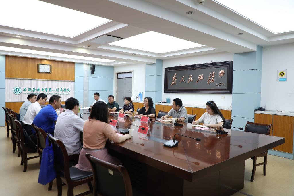 8月8日,民建安徽省委会办公室主任秦克明、民建安徽省委会社会服务部副部长侯松涛、民建安医大支部主委陈智勇、宿州市医保局局长赵庆民、安医大二附院医保办科员吴雪枫一行来院调研交流。副院长王珩、党委统战部部长吴三兵、医保办主任蒋心梅等参加会议。会议由王珩主持。