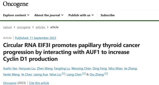 近日,安徽医科大学第一附属医院章秋教授团队和中国科学技术大学生命科学与医学部陈亮研究员团队在《自然》子刊Oncogene(中科院一区)在线发表题为“Circular RNA EIF3I promotes papillary thyroid cancer progression by interacting with AUF1 to increase Cyclin D1 production”的研究论文,揭示了环状RNA circEIF3I通过结合AUF1以调控Cyclin D1进而促进甲状腺乳头状癌(Papillary thyroid cancer,PTC)发生发展的功能及机制。