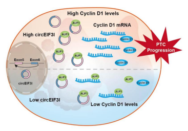 环状RNA(circRNA)是一类共价闭合环状的非编码RNA,在生理和病理过程中发挥着重要的调控功能。一系列研究显示,环状RNA在几乎所有肿瘤类型的发生发展中发挥重要功能。为了探索环状RNA在PTC中的功能及机理,章秋教授团队联合耳鼻喉头颈外科刘业海教授团队对PTC临床样本RNA测序分析并鉴定了circEIF3I在PTC中高表达,通过核质分离和原位杂交证实circEIF3I主要定位在PTC细胞的细胞质中。同时,体外细胞实验发现circEIF3I促进PTC细胞增殖、迁移和侵袭,促进细胞周期转换,并在小鼠体内实验中证实其促进PTC生长和肿瘤进程。进一步探究其机制,通过细胞内源性RNApulldown和RNA IP实验证实circEIF3I作为分子支架与细胞质中的经典RNA结合蛋白AUF1(AU-rich element RNA-binding factor 1)相互作用,同时本研究通过体外合成circEIF3I与AUF1蛋白并证实在细胞外两者仍然有结合作用,circEIF3I结合AUF1后降低了AUF1对其靶标Cyclin D1 mRNA的降解,最终促进了PTC的发生发展。该研究探索环状RNA通过与蛋白相互作用调控PTC进程,为PTC早期诊断和靶向治疗提供了新的实验依据和潜在的干预靶点。