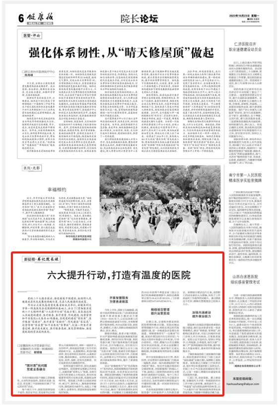 《健康报》2023年10月23日第6版刊发了校党委副书记、院党委书记谢瑞瑾署名文章——《六大提升行动,打造有温度的医院》。全文从党建引领促进业务发展、智慧服务方便患者就医、精细化管理提升运营质效、内涵建设提升群众职工满意度等四个方面,展示了医院在开展“六大提升行动”以来高质量发展的实践成效,体现了医院坚持把保障人民健康放在优先发展的战略位置、坚持以人民为中心的发展思想,展现出安医人为打造一所医疗质量过硬、医疗技术拔尖、医疗服务高效、医院管理精细、满意度较高的有“温度”的医院所做的不懈努力。