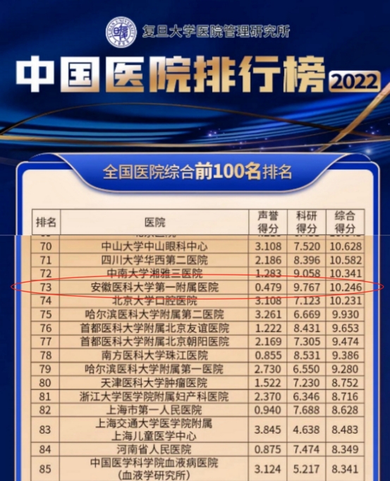 11月25日下午,复旦版《2022年度中国医院排行榜》正式发布,安医大一附院位居全国第73位,华东地区第17位,其中科研学术排名全国第38位,较去年上升7位。在此前发布的2022年中国医院科技量值排行中,安医大一附院综合排名全国第60位,两大榜单均稳居安徽省首位。