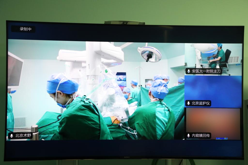 上午9时,梁教授首先开展机器人辅助腹腔镜下根治性前列腺切除术,随后又完成了一台机器人辅助腹腔镜下肾部分切除术。手术画面通过合肥和北京之间的“5G+固网专线”使得远隔千里的画面如在眼前,完美展现了机器人手术的优势及远程连接的稳定性。