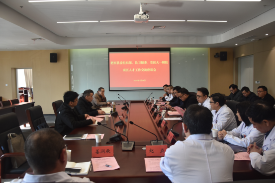 1月24日下午,肥西县委组织部副部长何桂明、县卫健委党委委员侯曙明一行来我院南区开展人才工作交流座谈,并慰问南区高层次人才代表。医院党委委员、正处级组织员丁长明出席会议,南区过渡期工作专班成员、人力资源部、南区相关职能部门负责人及高层次人才代表参加座谈,会议由南区专班成员王佐主持。