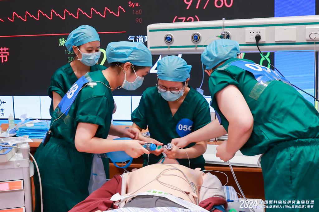 此次大赛共分为四大模块,具有赛程长、轮次多、考核内容范围广等特点,现场竞争激烈,精彩纷呈。赛前以消化系统常见病制作的科普视频作品“‘胆石’过人,命悬‘胰腺’”,生动简洁、融学于趣,获全网投票第四名(共45个作品);正式比赛经过两轮初试,从第十五名上升至第四名(45选20)晋级复赛;复赛病例汇报环节,我院选手顶住压力,从容不迫,独立完成病例汇报和专家提问。科研课题设计汇报环节,全体师生彻夜未眠,搜集资料,以内容详实、科学严谨的ppt形式完成现场汇报和答辩,以第六名(20选10)的成绩挺进决赛;决赛现场通过临床模拟情境综合案例,5名研究生分工合作,从容应对,协作完成心跳骤停抢救、上消化道出血诊治、急腹症接诊等流程及气管插管、深静脉穿刺、三腔两囊管置入、外科缝合及腹腔镜下基本手术技能等操作,最终斩获团体二等奖。