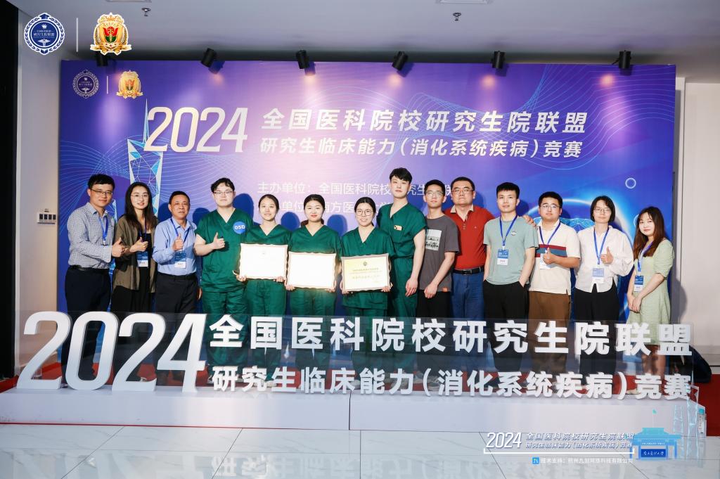 这支载誉而归的队伍是由我院消化内科专业赵梦雪、陈卓、朱亚雯、外科学(普外)专业孙浩楠、袁帅、田鹏飞(候补)6名研究生,临床技能中心主任张志功作为领队,以及校研究生学院副院长潘发明、院科研处负责人谢峻作为科研指导和其他来自消化内科、普外科、急诊医学科等的指导教师共同组成。