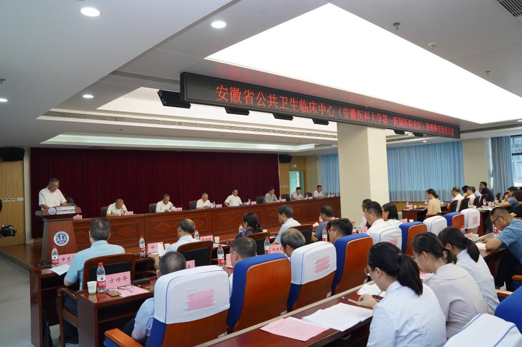9月12日下午,省公共卫生临床中心(我院北区)管理移交动员大会顺利举办,安徽省卫生健康委党组书记、主任刘同柱,省疾控局副局长、二级巡视员王海,安徽医科大学党委书记王琦、校长翁建平,党委常委、副校长余永强出席会议,党委常委、组织部部长李阳新宣读干部任免文件。我院院长孙倍成等在院院领导出席会议。