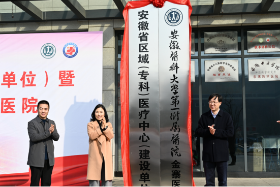 朱煜与陈旭林共同为“安徽省区域(专科)医疗中心(建设单位)”暨“安徽医科大学第一附属医院金寨医院”揭牌。