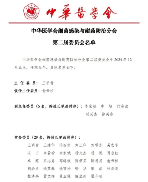 12月22日,中华医学会细菌感染与耐药防治分会换届选举大会顺利举行,会议选举产生了中华医学会细菌感染与耐药房防治分会第二届委员会,我院感染病科李家斌教授当选中华医学会细菌感染与耐药防治分会第二届委员会副主任委员。