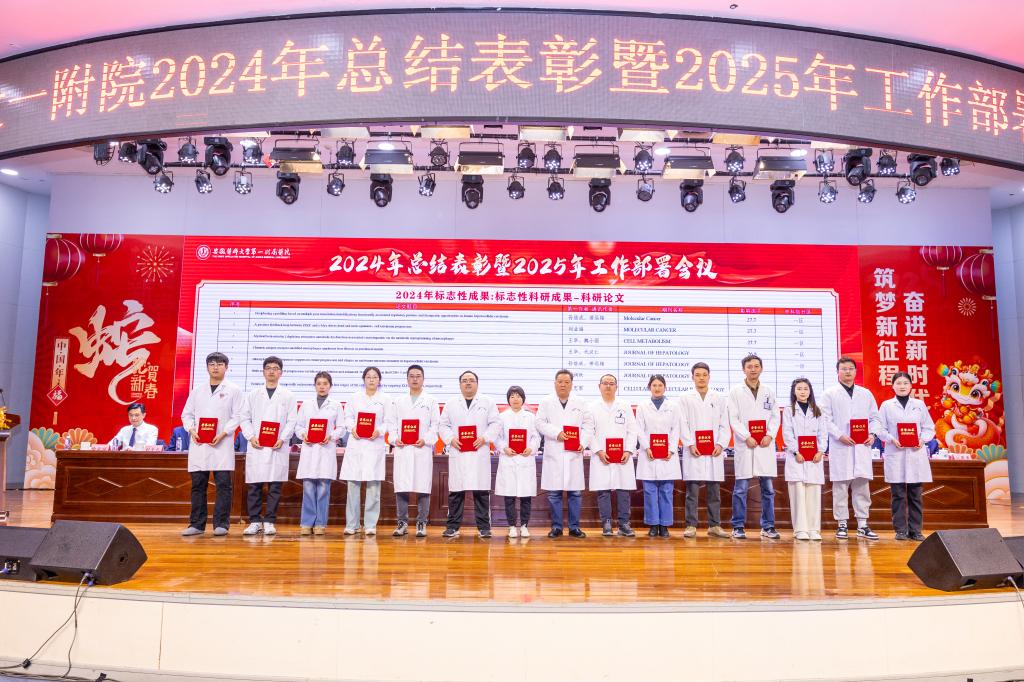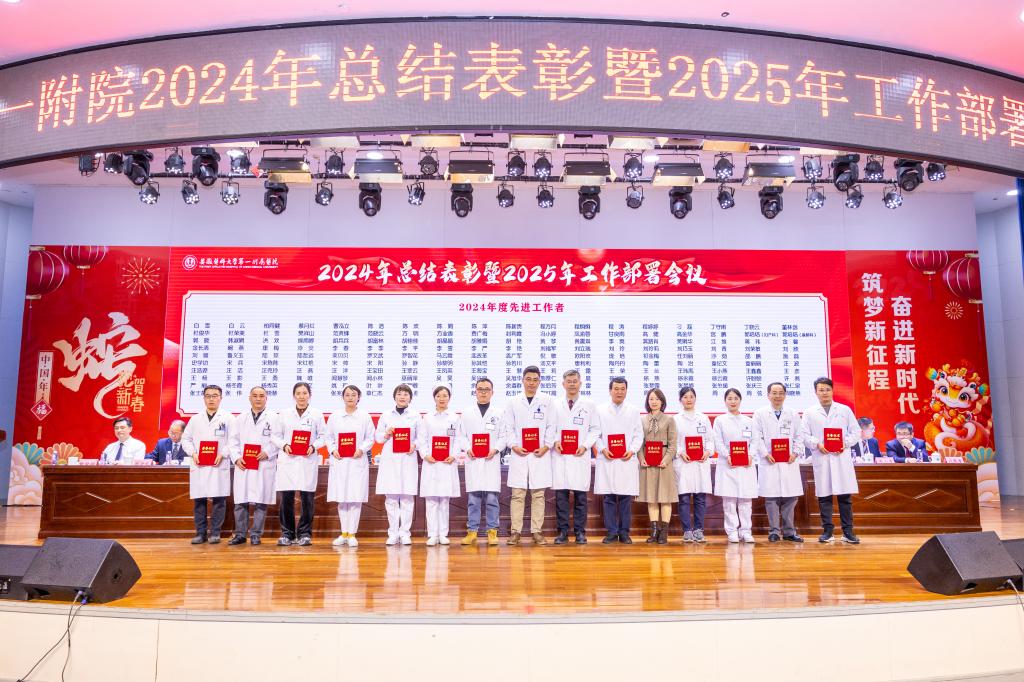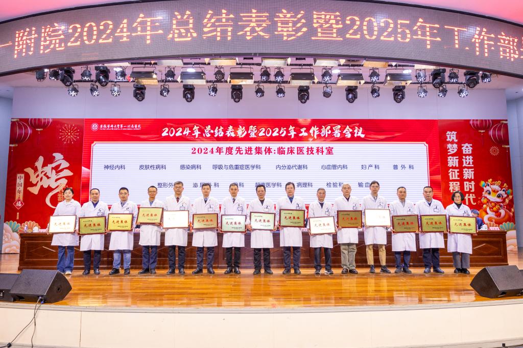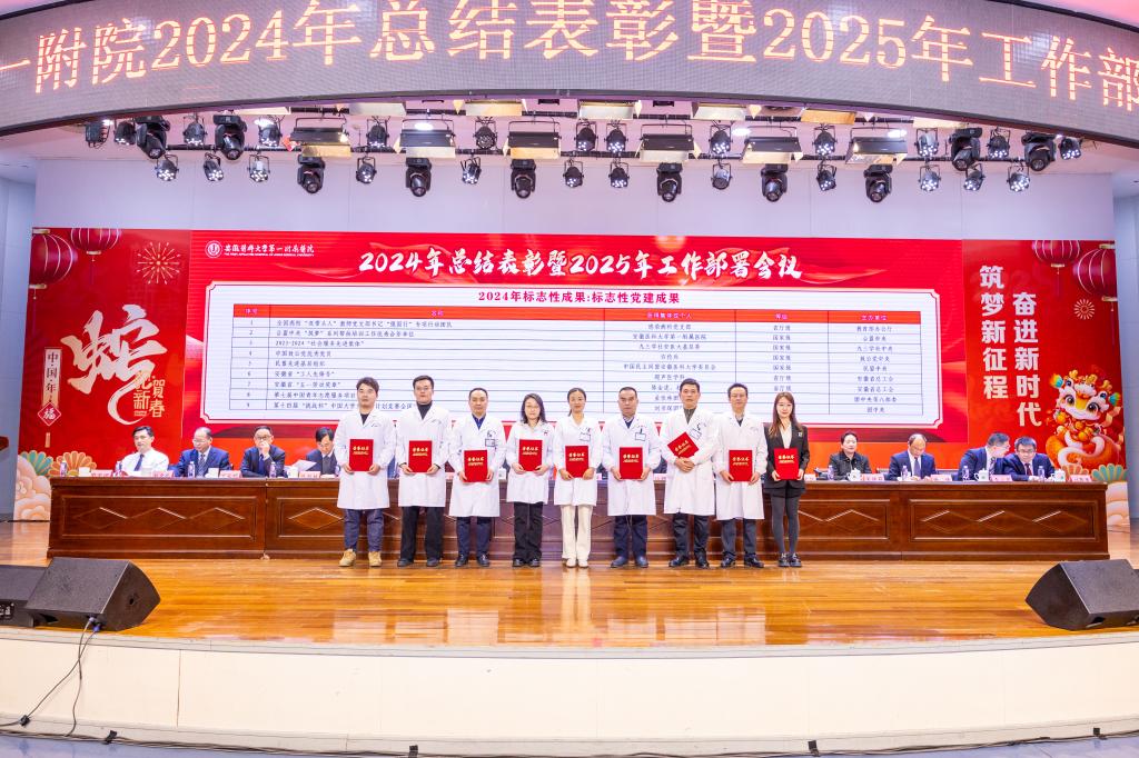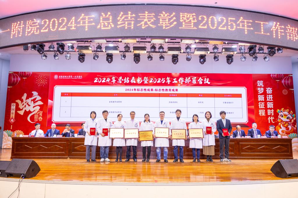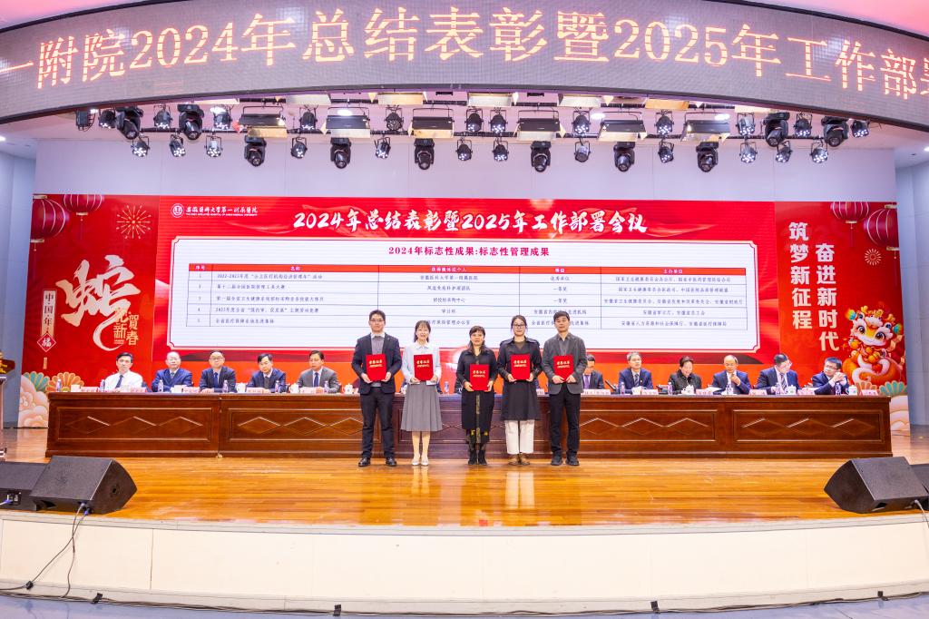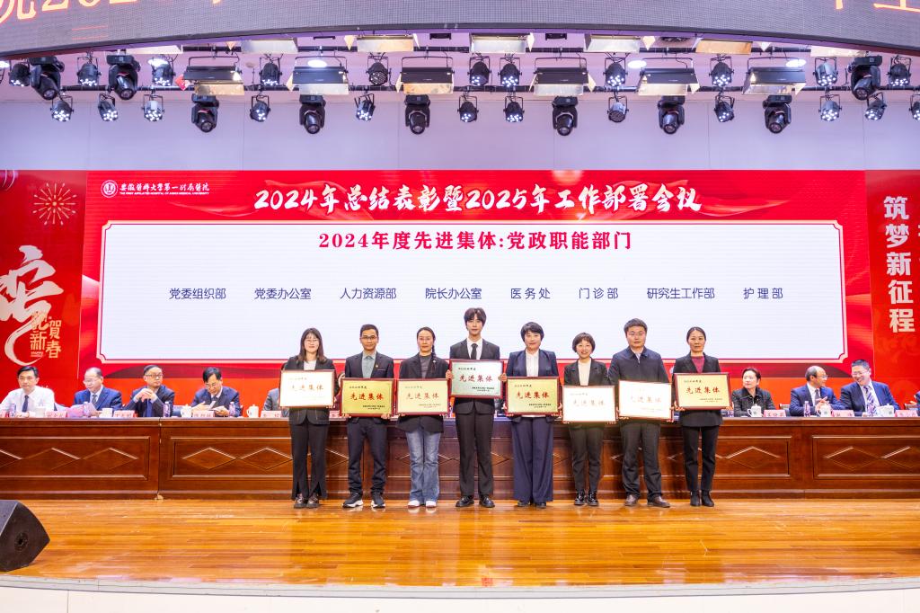 翁建平代表学校对我院2024年工作给予充分肯定。他指出,过去一年一附院上下凝心聚力、砥砺奋进,交出了一份优异答卷。党建引领更加坚强有力,胜利召开第五次党代会,全面总结了近年来工作中取得的亮点成绩,为今后医院的高质量发展指明了方向、明确了目标;一院多区发展格局不断稳固,南区开诊一周年发展平稳向好,骨科医院挂牌,国家心血管病区域医疗中心北京安贞医院安徽医院主体结构封顶,北区顺利移交并获批三甲医院;科技创新能力全面提升,持续完善“登峰计划”,全面启用“科研创新服务平台”,国家自然科学基金立项数目、论文发表数量质量屡创新高,为高质量发展注入了强劲动能。