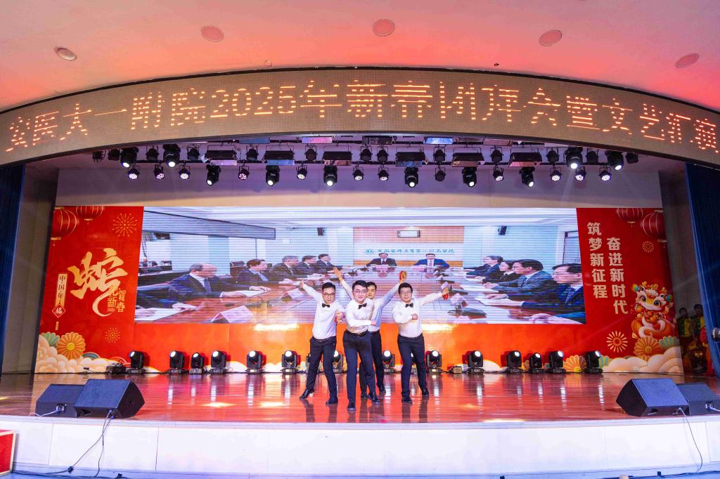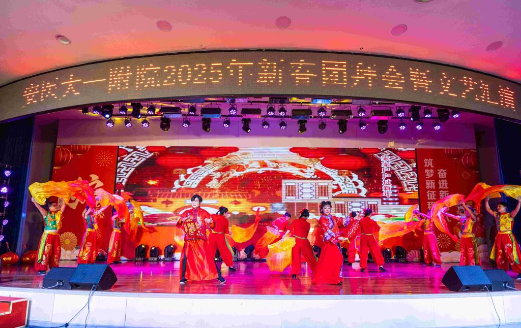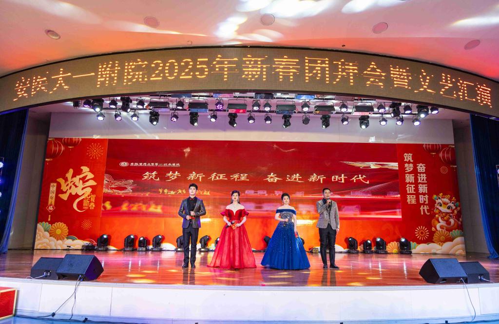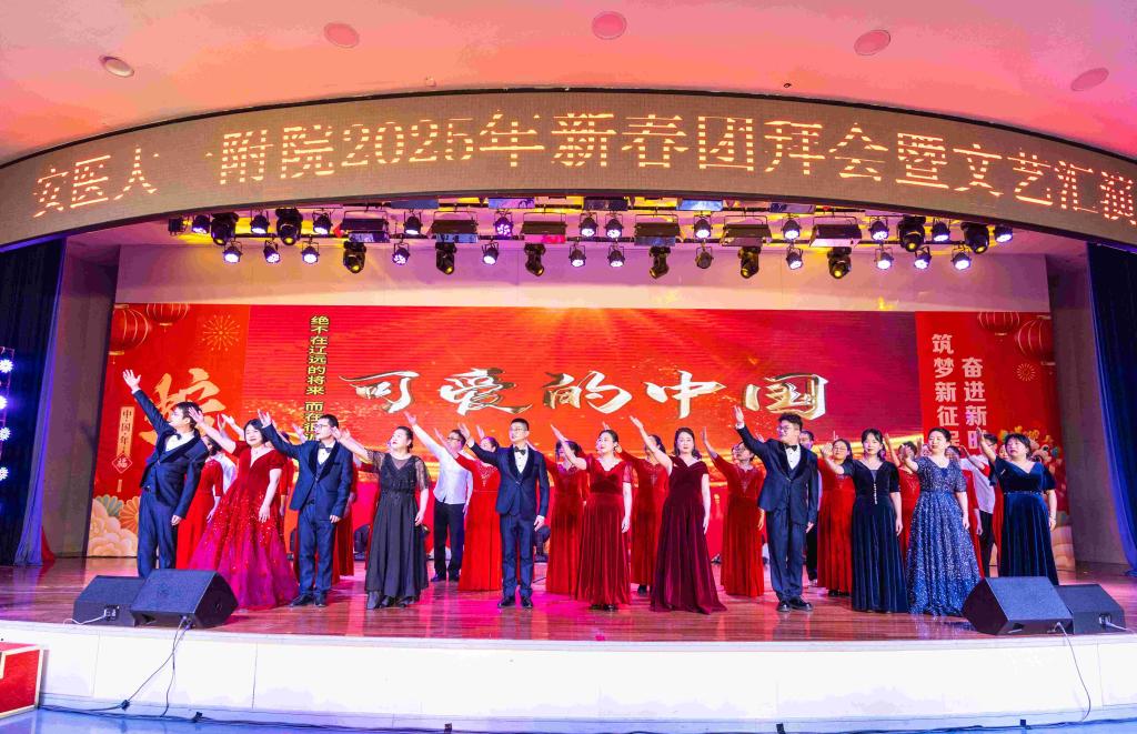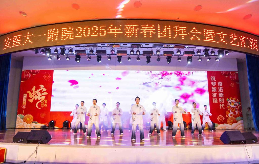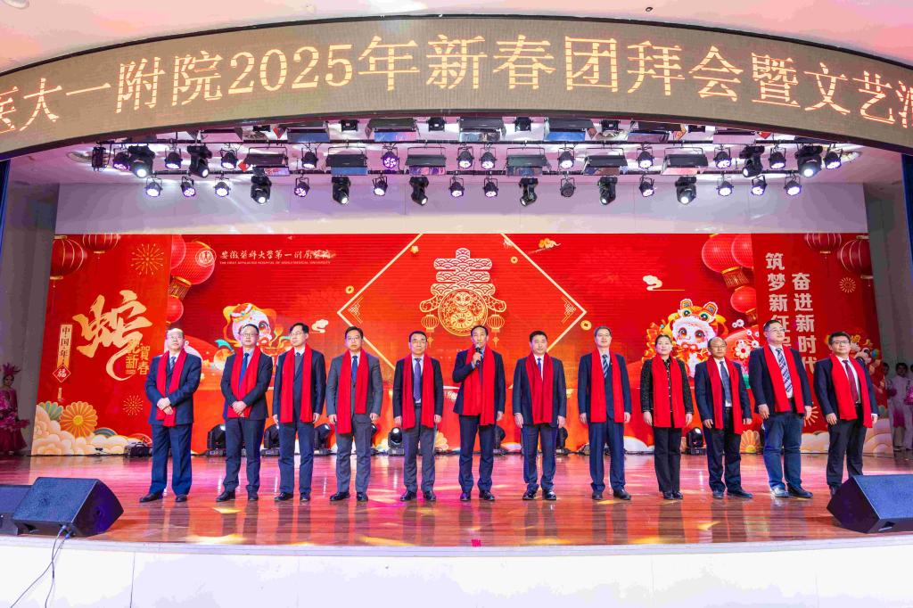 总结表彰暨工作部署会后,“筑梦新征程 奋进新时代”2025年新春团拜会暨文艺汇演在会场举行。徐朝阳、孙倍成带领医院领导班子向全院职工拜年,向一年来为医院建设发展作出贡献的全体师生医护员工致以崇高敬意和衷心感谢。