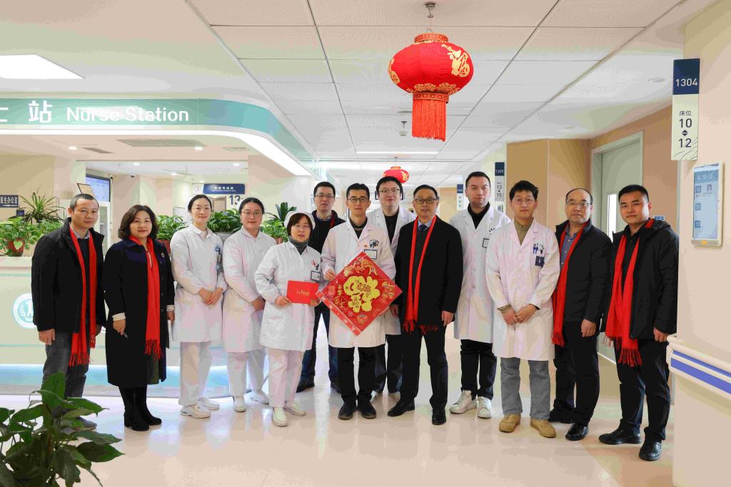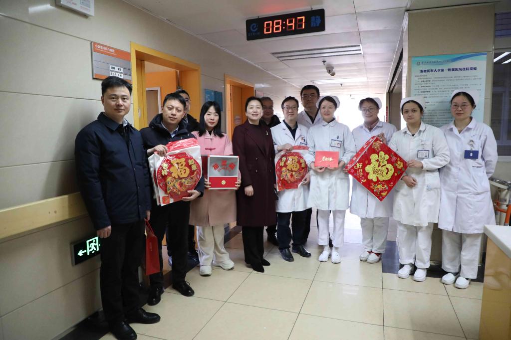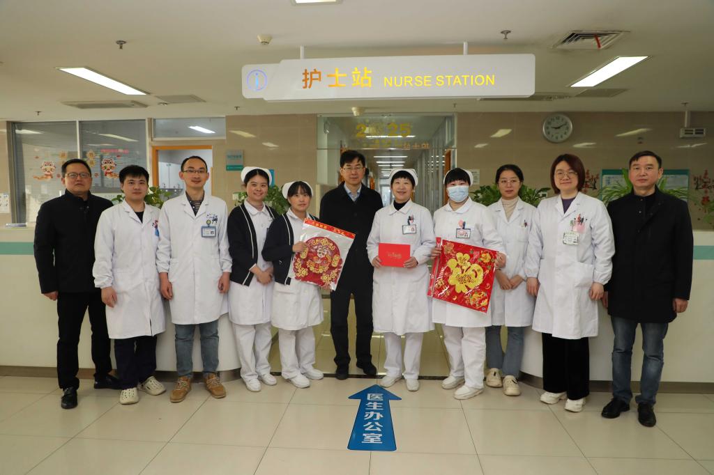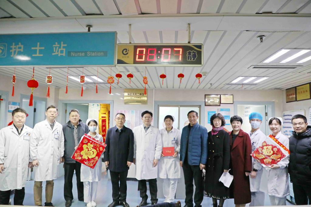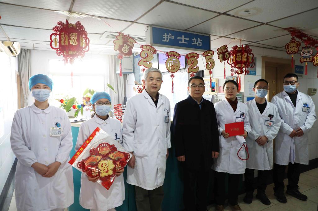 金龙腾云旧岁去,灵蛇献瑞启新篇。1月28日(农历大年三十)上午,院领导徐朝阳、孙倍成、李阳新、王珩、吴晓莉、陈旭林、谢峰、丁长明、李小虎深入医院临床、医技和行政后勤科室,对春节期间坚守岗位的医务人员和干部职工进行亲切慰问,并向他们送上节日的祝福。