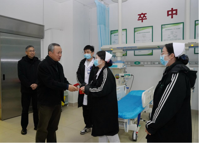 翁建平一行实地走访了住院药房、医保办、门诊服务台、收费处等各个岗位,了解春节期间医疗运行情况与服务保障情况。深入急诊小区、重症医学科、创面修复与整形美容科、呼吸与危重症医学科、内分泌与代谢病科等临床一线科室和病房,与医务人员亲切交谈,详细询问春节期间的值班安排和患者收治情况,对大家过去一年的辛勤付出表示衷心感谢,并送上新春红包,鼓励大家在新的一年里继续保持积极昂扬的精神状态,全身心投入到医疗救治工作中。