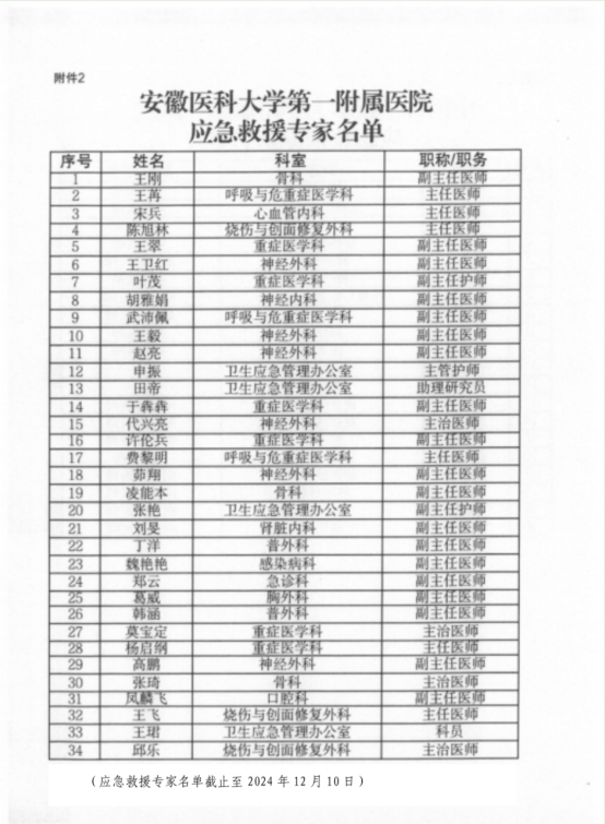 在做好救援工作的同时,医院积极储备突发事件救援专家人才。2024年度,我院累计向安徽省卫健委推荐医疗服务管理及应急救援省级专家库专家137名,向安徽省应急厅推荐防灾减灾应急管理专家3名。