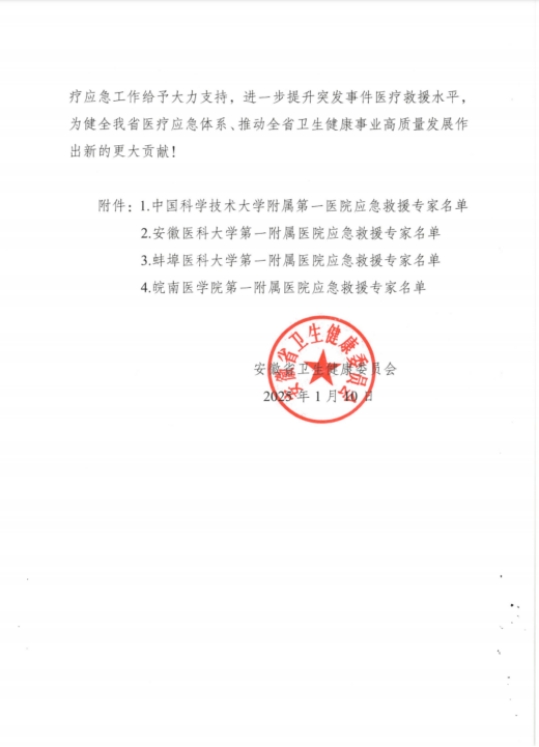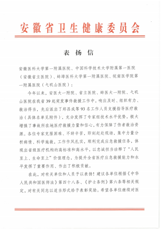 近日,安徽省卫生健康委员会正式发文,对我院2024年度突发事件应急救援工作给予通报表扬。在过去的一年里,在各级领导的深切关怀和有力指导下,医院在突发事件救援工作方面创下了三项全省之最:全年处置省卫健委指派突发事件共13起、选派34名核心专家、累计投入60人次紧急驰援,三项关键指标均位列全省医疗机构榜首。