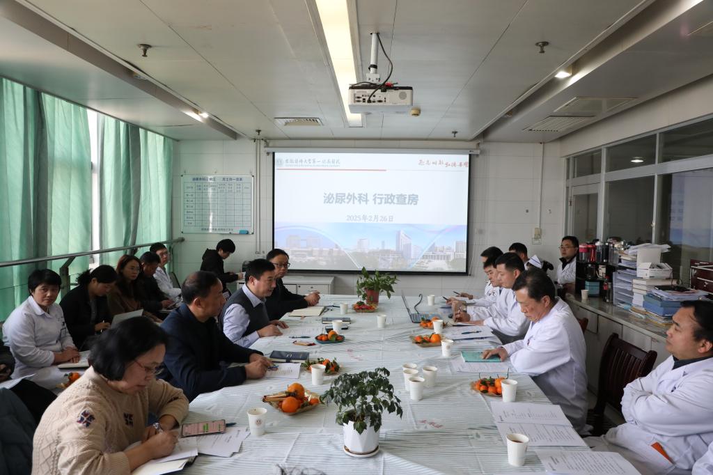 2月26日下午,校党委副书记、院党委书记徐朝阳,院长孙倍成,副院长王珩,正处级组织员、南区党委书记丁长明赴泌尿外科三病区开展行政查房。会议由孙倍成主持。