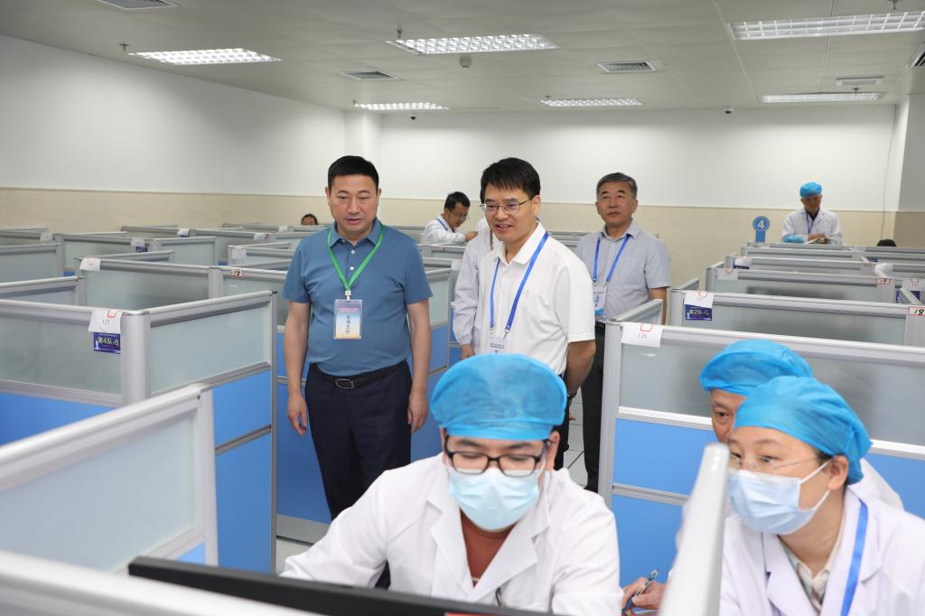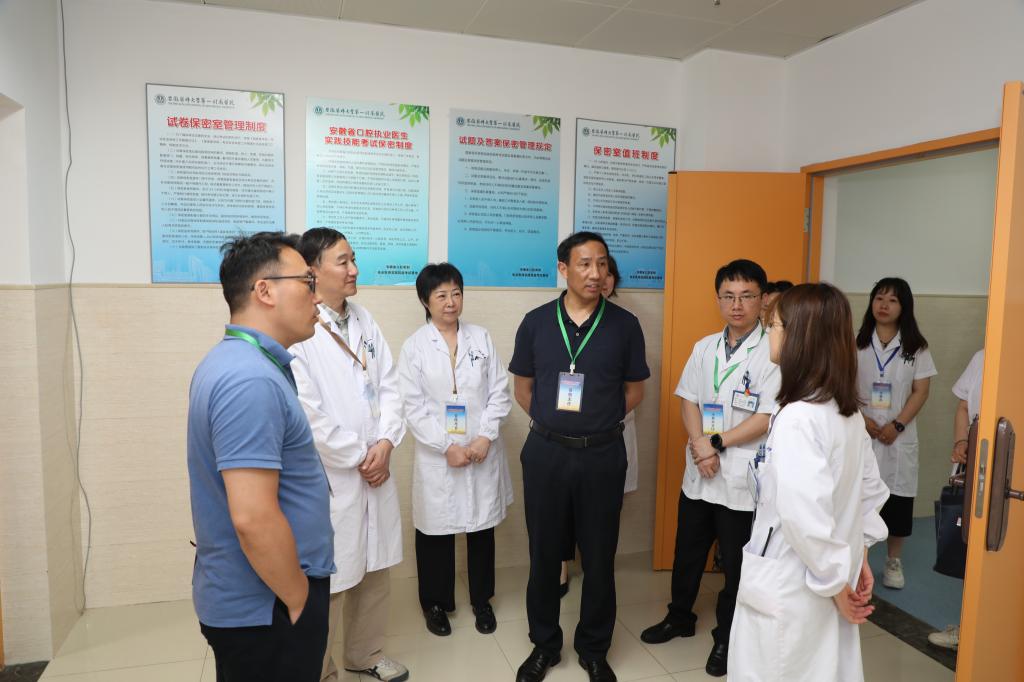 国家医学考试中心主任职员黄蓉、北京大学口腔医院医务处处长施祖东、北京大学口腔医院教授杨亚东一行前来我院调研指导实践技能考试工作,省卫生健康委医政处三级调研员陈玲,医院院长、基地主任孙倍成陪同调研。专家组深入各个考站详细了解考试流程、设施设备、考官执考以及考务管理等情况。