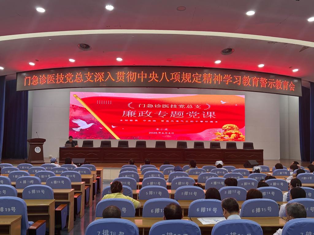 6月4日上午,门急诊医技党总支在内科医技楼四楼会议中心召开深入贯彻中央八项规定精神学习教育警示教育会,副院长李小虎参加会议并讲授专题党课。门急诊医技总支负责人刘晔主持会议。