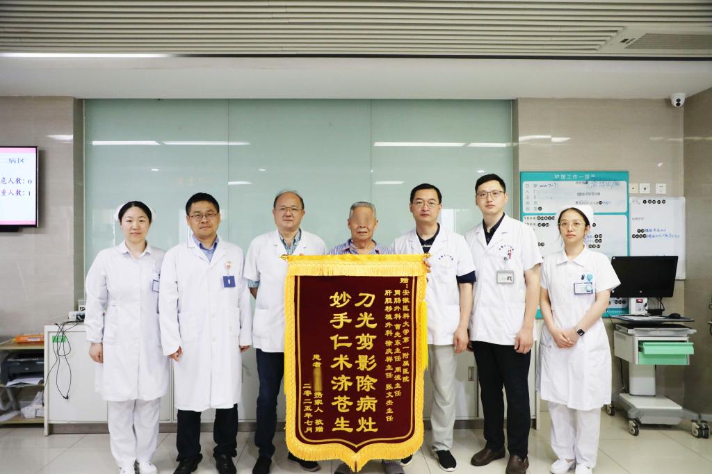 手术当日,在手术室、麻醉科、超声科、医学影像科等科室的护航下,西区副院长、肝胆胰及移植二病区张文杰和徐庆祥团队率先上台,通过荧光和术中超声的定位,实施肝转移灶精准切除,最大限度保留健康肝组织;随后,胃肠外科曹先东、周波团队“接棒”,在腹腔镜下精细分离腹腔粘连,完整切除乙状结肠肿瘤并完成一期吻合,保障肠道功能。整个手术从麻醉到复苏全程历时2小时,术中出血仅50毫升,仅仅通过几个小洞代替了原先的大切口。术后,王大爷便转回了普通病房,一周后便顺利出院。