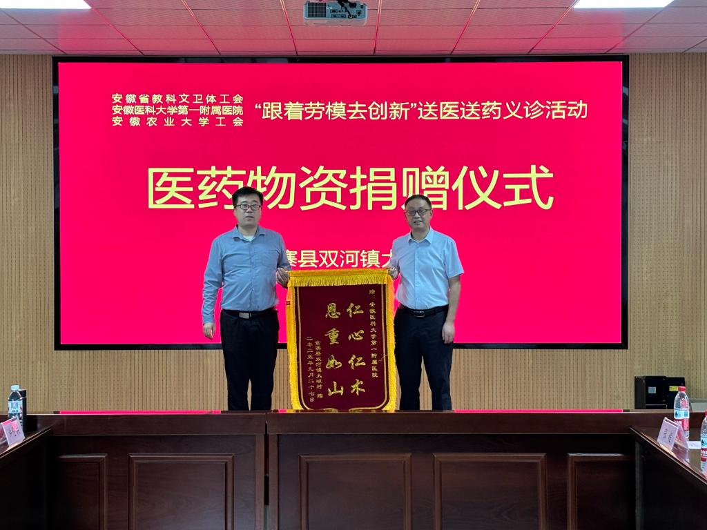 捐赠仪式上,丁长明介绍了省教科文卫体工会“跟着劳模去创新”项目的渊源,深情回顾了医院与金寨县的历史情谊。他表示,医院此次送医送药,旨在践行“人民至上、生命至上”理念,将优质医疗资源送至基层一线,助力革命老区乡村振兴与医疗事业发展。仪式上,丁长明还代表医院接受了双河镇中心卫生院及大畈村赠送的锦旗。