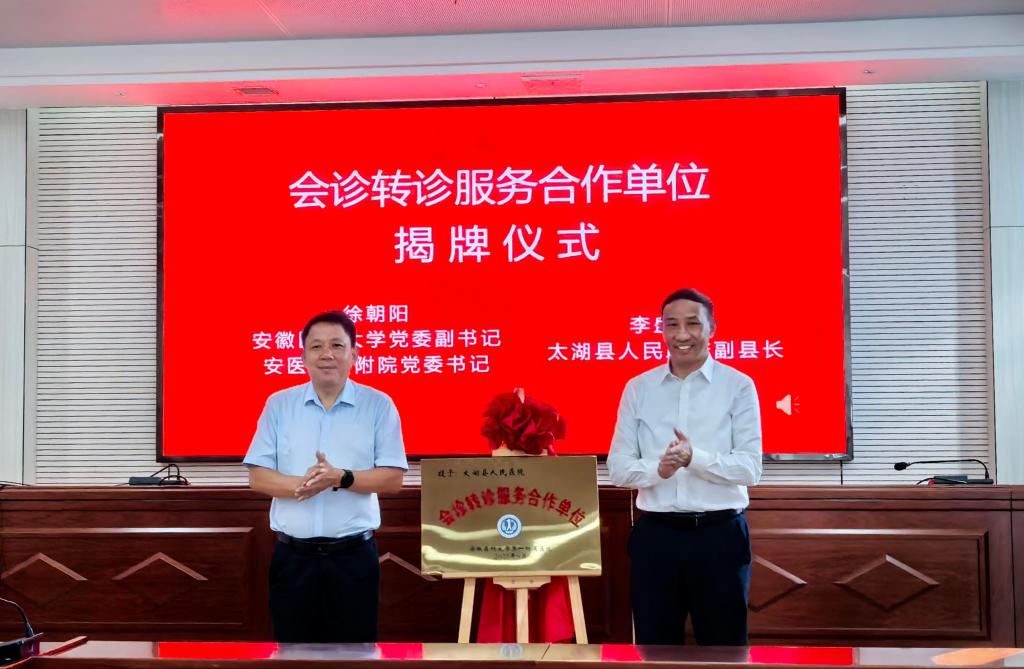 会上,徐朝阳介绍了我院的发展历程。他指出,加强医联体建设是贯彻落实国家分级诊疗政策、推动优质医疗资源下沉的重要举措。作为省属头部医院,我院将着力优化转诊会诊流程、务实推动专家资源下沉、系统加强人才联合培养、协同完善沟通保障机制,助力县医院专科能力提升,切实满足太湖县群众“看好病、好看病”的就医需求。