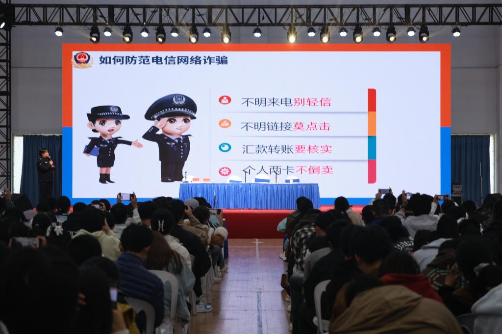 李长和警官带领肥西县公安局反诈宣传员开展学生防范电信网络诈骗教育专题报告。他们结合近期高校高发案例,详细讲解电信网络诈骗的涵义及类型,让大家对电信网络诈骗及其严重危害性有了更直观、更深刻的认识;深入剖析了“刷单返利”“游戏交易”“冒充客服退款”“冒充熟人诈骗”等常见诈骗手段的作案逻辑和防范措施,教育引导学生增强防范意识,提升反诈能力。