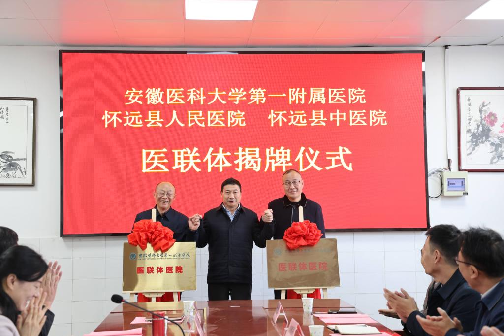 会上,怀远县人民医院党委副书记、院长褚永光,怀远县中医院党委书记邵南辉分别介绍了各自医院的发展历程和现状。孙倍成与褚永光、邵南辉共同为“安徽医科大学第一附属医院医联体医院”揭牌,汪安勇与褚永光、邵南辉共同为“安徽医科大学第一附属医院会诊转诊服务合作单位”揭牌。