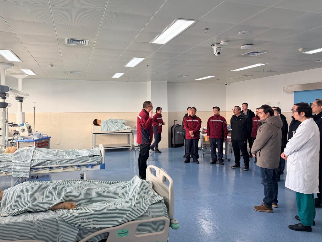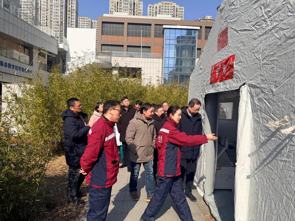 演练期间,评审专家依次考察了基地模拟演练与教学模块、帐篷医院展开及人机结合情况、卫生应急物资库房以及急诊区域,通过实地查看、现场交流等方式,对基地功能布局、装备配置与运行流程进行了细致评估,并在指挥中心与帐篷医院内的应急队员进行视频互联互通。