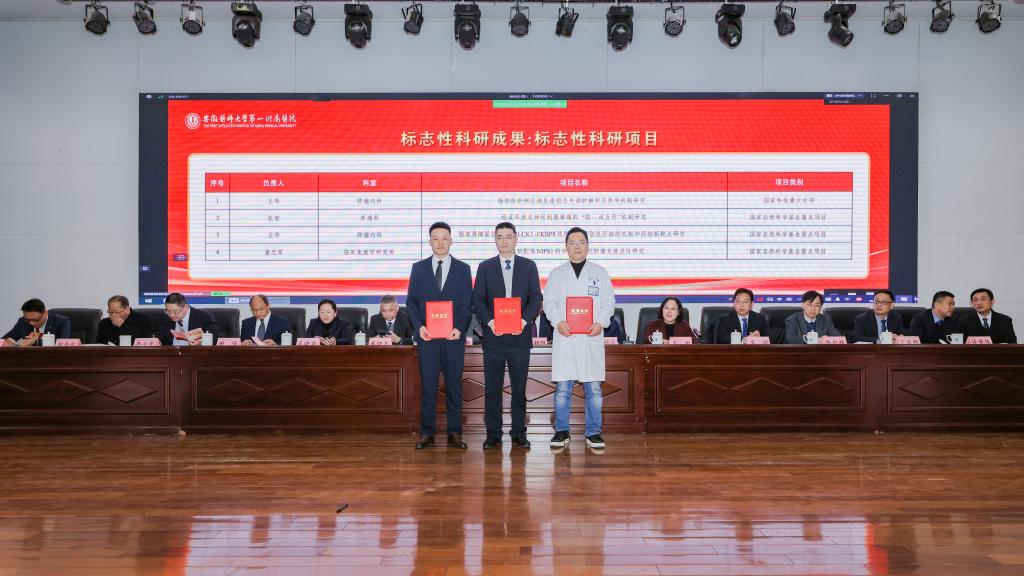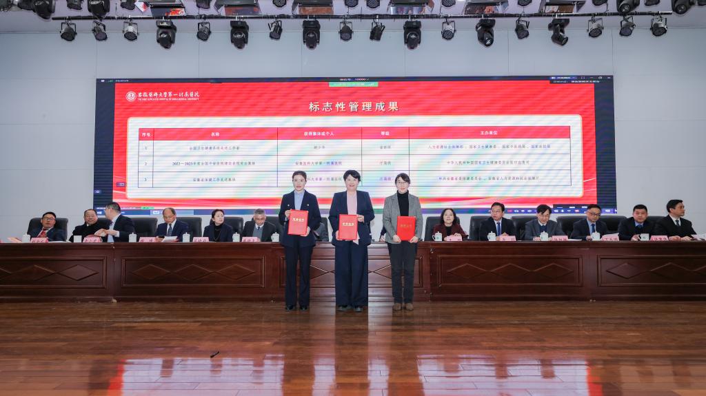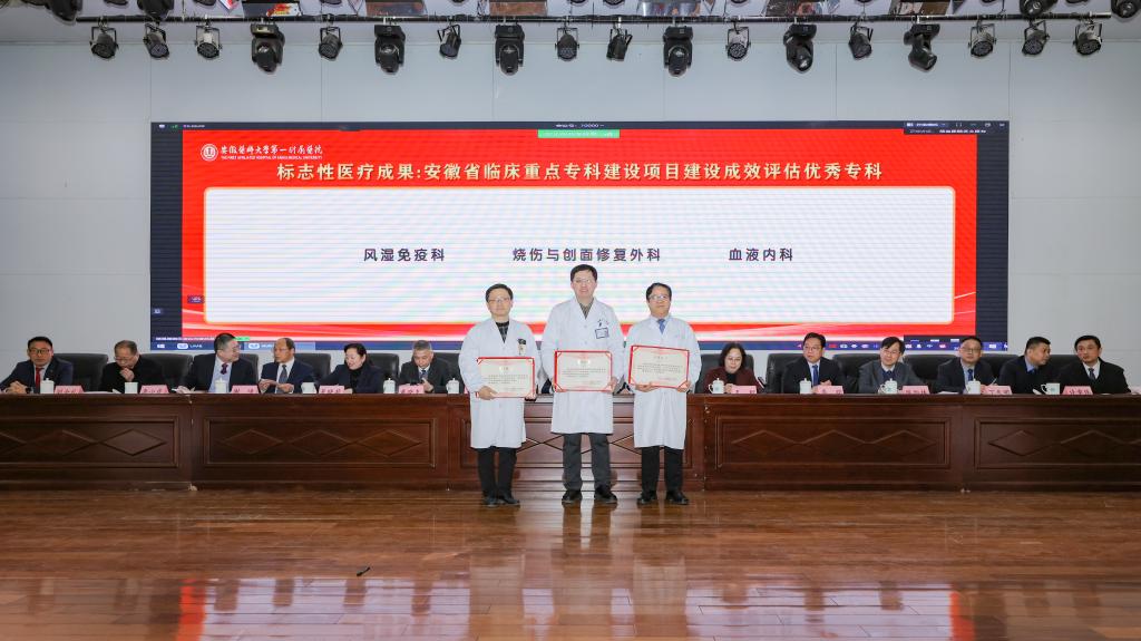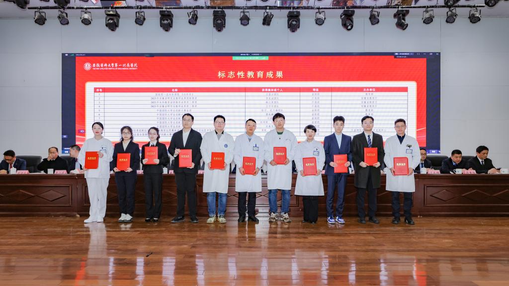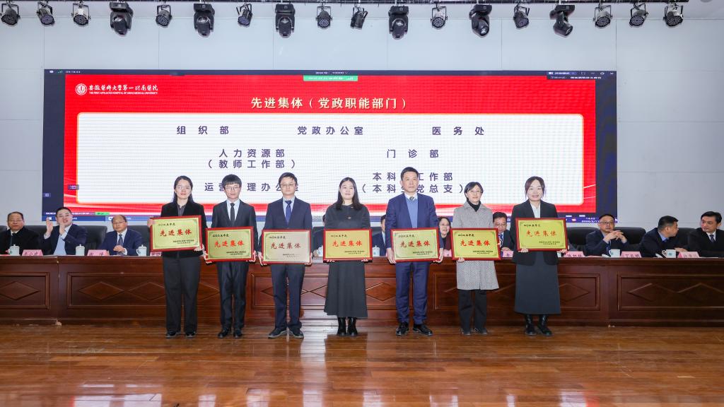 孙倍成作医院2025年工作表彰及2026年工作部署。2025年是“十四五”收官之年,是医院改革创新、强基固本、实现全面提升的重要一年。在大学及上级主管部门的坚强领导下,全院上下坚持以习近平新时代中国特色社会主义思想为指导,深入贯彻落实党的二十大及历次全会精神,紧紧围绕高水平医院高质量发展、校第九次党代会和院第五次党代会确定的目标,凝心聚力、锐意进取,医院在全国三级公立医院绩效考核中连续六年取得A+,CMI值位列全省第一;牵头获批国家科技重大专项,设立“尚永丰院士工作站”,转基因猪-人辅助肝移植技术取得世界突破,荣获中国国际大学生创新大赛国赛金奖;国家心血管病区域医疗中心北京安贞医院安徽医院主体结构全面封顶;临床研究医院顺利开诊,医院发展呈现“一体多翼”“多轮驱动”新格局,医教研管各项指标取得了历史最好成绩。2026年医院将重点做好以下工作:一是聚焦医疗提质,构建优质高效医疗服务新体系;二是聚力科技创新,塑造科研创新发展新优势;三是深耕人才沃土,构建近悦远来人才新生态;四是深化医教协同,培育卓越医学教育新动能;五是深耕运营管理,提升现代医院治理新效能;六是繁荣医院文化,彰显百年安医品牌新形象;七是强化政治引领,以高质量党建领航医院发展新征程。