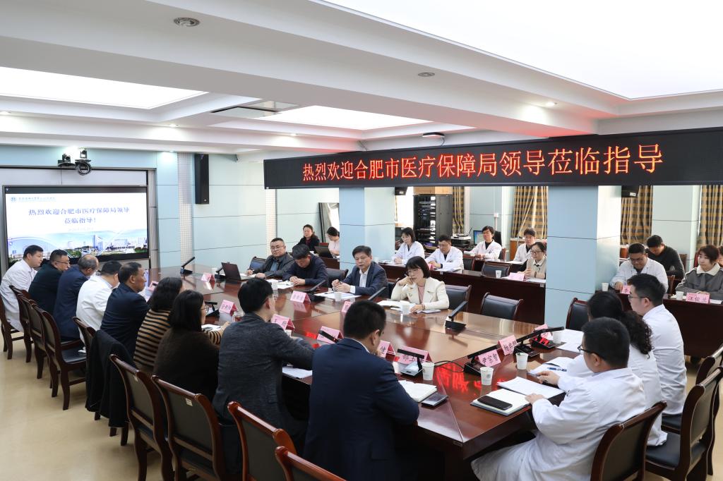 3月25日上午,合肥市医保局党组书记、局长唐世金一行来院调研指导DRG付费改革工作。局医药管理和待遇保障处处长葛慧敏、医保基金管理中心副主任陈玮陪同调研。校党委副书记、院党委书记徐朝阳,院党委副书记、院长孙倍成及总会计师谢峰出席会议。会议由副院长王珩主持。
