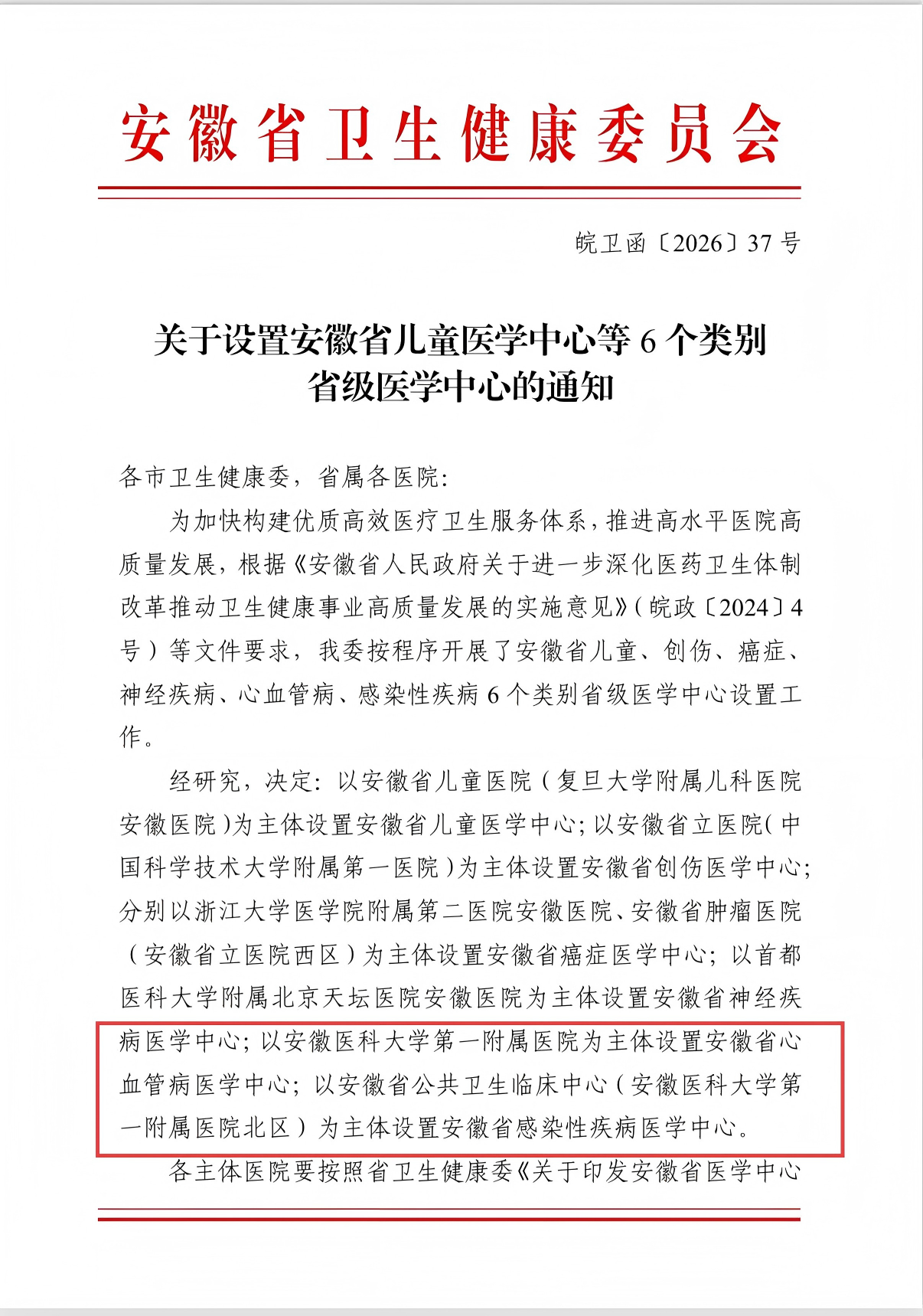 根据通知要求,以安徽医科大学第一附属医院为主体设置安徽省心血管病医学中心;以安徽省公共卫生临床中心(安徽医科大学第一附属医院北区)为主体设置安徽省感染性疾病医学中心。