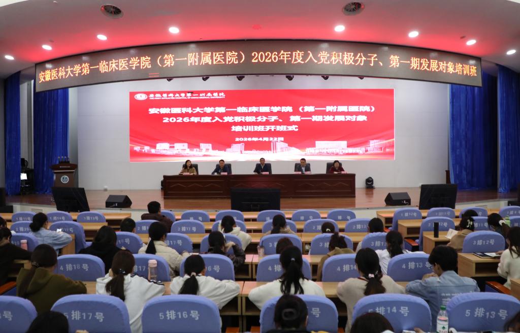 4月22日晚,我院分党校2026年度入党积极分子与发展对象培训班开班式在绩溪路院区内科医技楼四楼会议中心举行。校党委副书记、院党委书记徐朝阳出席开班式并作动员讲话,院党委副书记、副院长、总院区党委书记李阳新主持开班式。