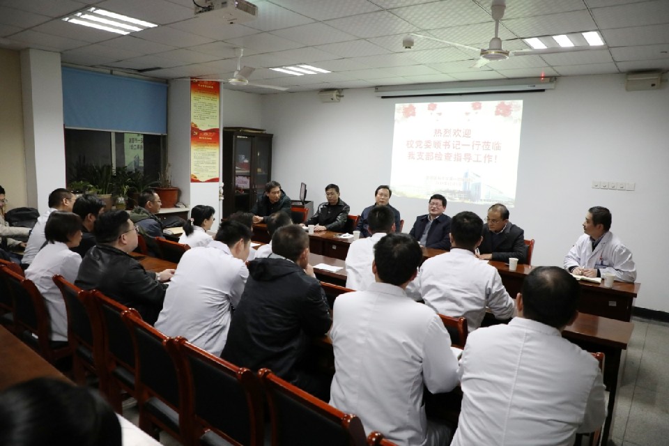 在全院“不忘初心、牢记使命”主题教育深入开展之际,12月3日下午,校党委书记顾家山来到我院药剂科党支部,就支部主题教育开展情况和党建工作进行调研。调研中,顾家山书记强调,党支部要将思想建党和理论强党贯穿于主题教育全过程,坚持学思用贯通、知信行统一,持续抓好支部标准化和规范化建设,围绕中心工作,服务于教书育人、治病救人的需要,切实提高服务临床各科室的能力。院长梁朝朝、党委副书记戴晓支及学校办公室相关负责人参加调研。