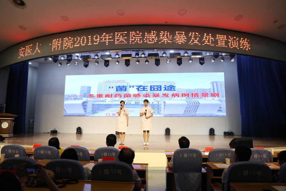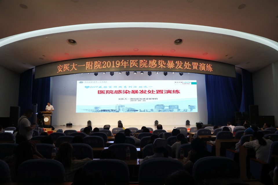 9月25日下午,安医大一附院感染管理科在内科医技楼四楼会议中心举办2019年感控宣传周系列活动之“医院感染暴发处置演练”情景剧比赛。医院党委书记金宗祥参加开幕式并讲话,安徽省卫健委医政处彭玉池主任参加了本次活动,医院党政领导、各职能处室负责人、党总支书记、感控委员会全体委员、各临床医技科室主任、护士长、监控医生和监控护士、部分实习同学及保洁人员参加了本次活动。活动开幕式由常务副院长李家斌主持。