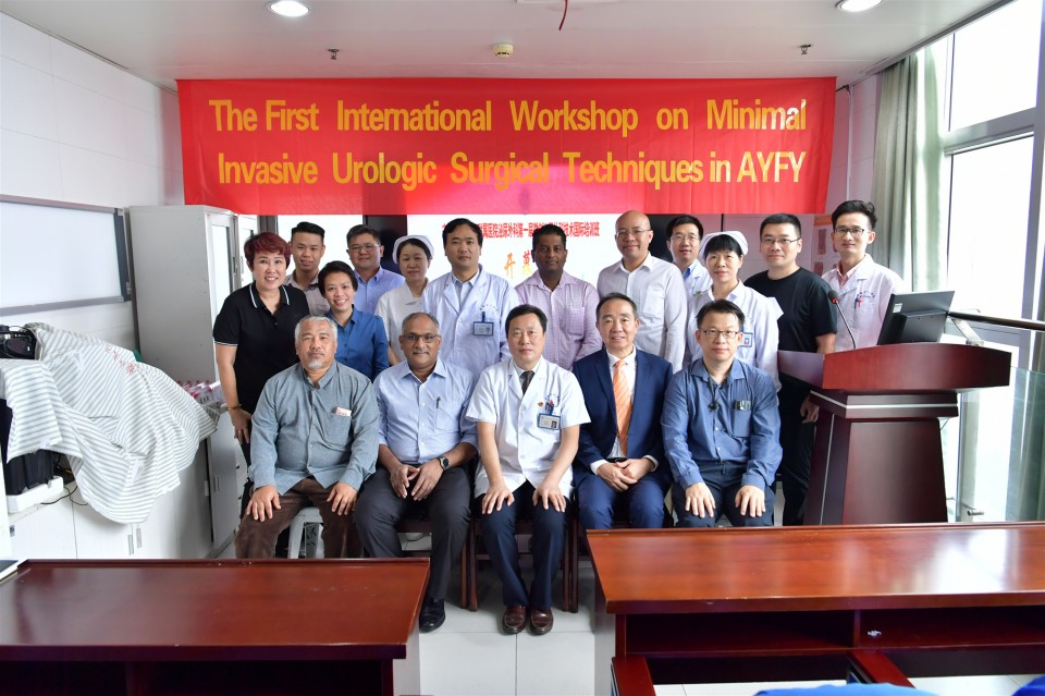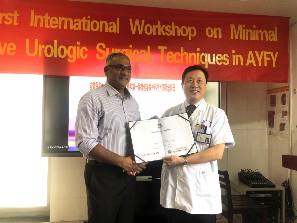 安徽在向世界展示医学创新成果的同时,也吸引越来越多的外籍医生来皖“取经”。在手术示范阶段,演示的54台手术包括经尿道电切镜、经输尿管镜、经皮肾镜、腹腔镜手术(Davinci机器人),几乎囊括泌尿系所有微创手术,其中梁朝朝教授先后演示了Davinci机器人辅助前列腺癌根治术和腰腹联合肾部分切除术,施浩强演示了包手腹腔镜膀胱癌根治术+盆腔淋巴清扫+回肠膀胱术、腹腔镜肾癌根治术等,周骏副主任演示了腹腔镜下肾部分切除术、巨大肾癌根治术等,张贤生教授演示了精囊镜检查术、显微镜下精索静脉结扎术等,张翼飞演示了经尿道双极等离子铲状前列腺剜除术,邹志辉博士演示了经尿道双极等离子解剖性前列腺剜除术(包括1例350克的超大前列腺),尹水平博士教学演示经尿道双极等离子前列腺剜除术,龚宾宾主治医师演示经尿道双极等离子前列腺电切术,高晶晶演示经尿道双极等离子前列腺电切术,刘明副主任演示经皮肾镜钬激光碎石术。还有樊松、赵磊副主任、王伟博士先后演示18台经皮肾镜钬激光碎石术或经尿道输尿管软镜碎石术。