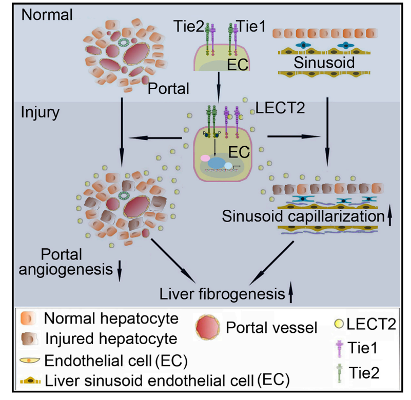 我国是肝病大国,肝病发病率和死亡率均高于世界平均水平。肝病患者大部分是慢性肝病,慢性肝病的特点是炎症和不断进展的纤维化,但目前肝纤维发病的分子机制不明确且尚无有效的治疗方法。该项研究将白细胞衍生趋化因子2(LECT2)鉴定为具有免疫球蛋白样和表皮生长因子同源性家族的受体酪氨酸激酶Tie1的功能性配体,揭示了LECT2-Tie1信号通路通过调控肝脏门脉血管新生和肝血窦毛细血管化进而调控肝纤维化进程的新机制,并提出了应区别对待门脉血管新生和肝血窦毛细血管化在肝纤维化进展中的不同作用的新观念。此外,该研究表明血清LECT2水平可能成为肝纤维化的潜在诊断标志物,且更重要的是,LECT2被证实可作为肝纤维化的潜在治疗靶标。