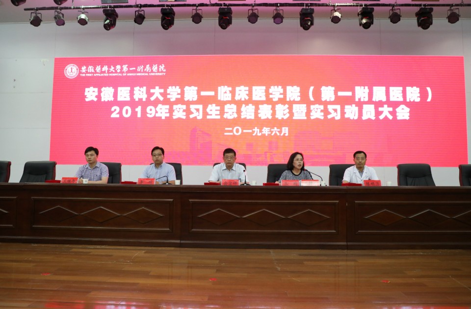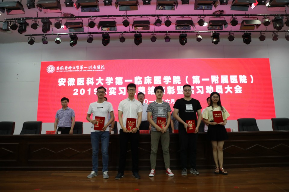 首先由党委副书李琮宣读《关于表彰2019年度优秀实习、实习队长的决定》;接着张雨阳同学作为2018年安徽医科大学大学生临床技能竞赛“特等奖”代表队队长、优秀实习生代表发言;随后,主席台领导为2018-2019学年优秀实习生、实习队长颁发奖状、奖金。