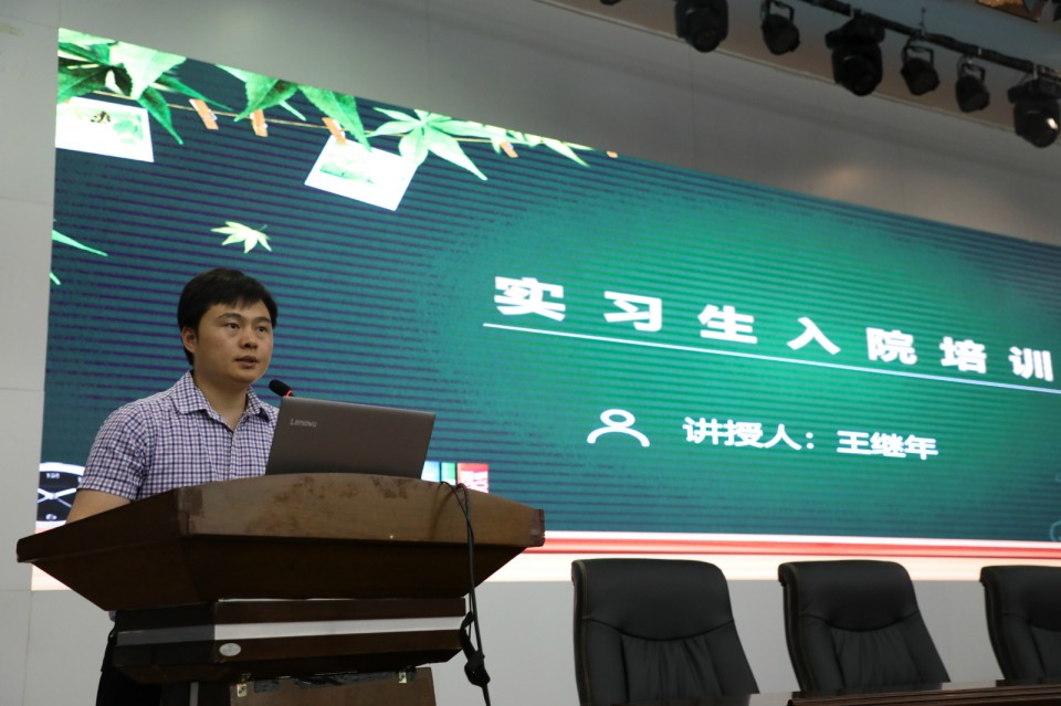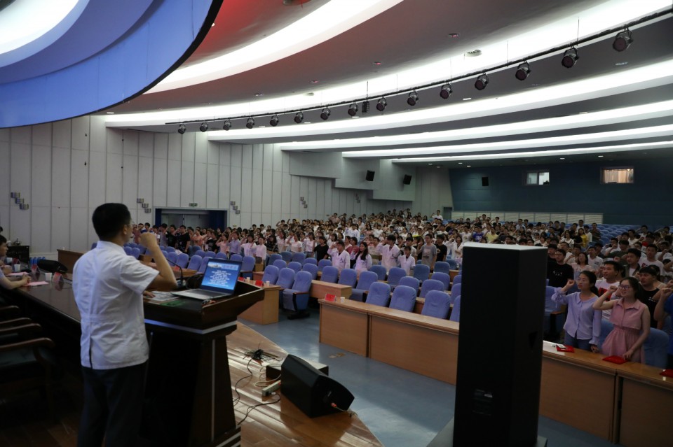 教育处处长陈明卫带领全体实习同学宣读医师誓言。临床实践教育科科长王继年从政策法规、实习要求、注意要点和信息系统四个方面向同学们介绍医院实习的具体要求和注意事项。