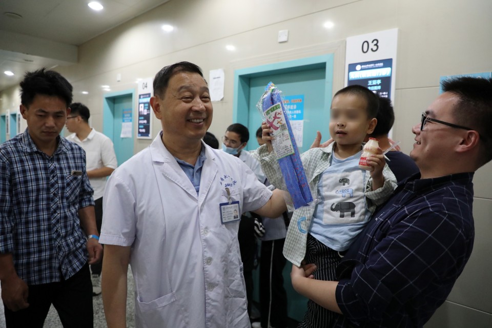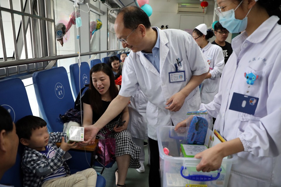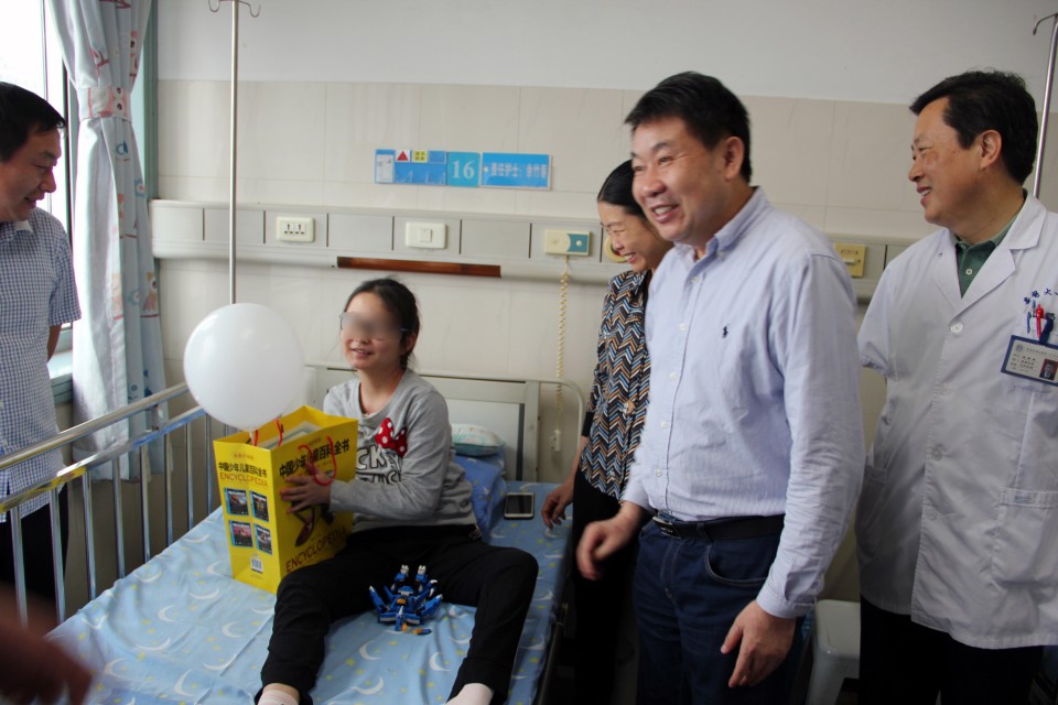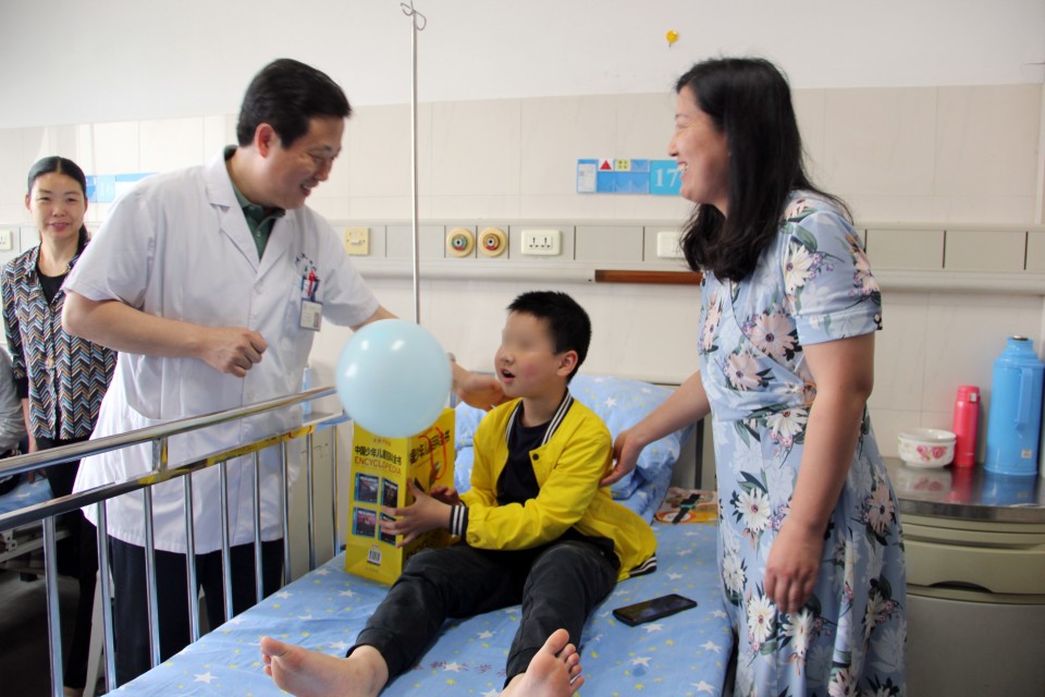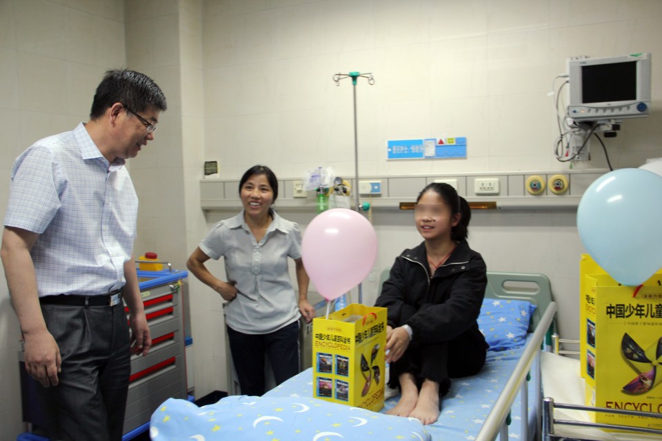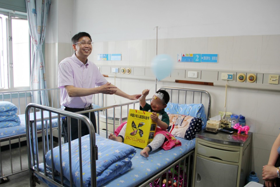 5月30日上午,院党委书记金宗祥、院长梁朝朝、副院长费广鹤、党委副书记戴晓支分别来到院本部和高新院区的儿科病房,在院团委书记黄尧、科室有关负责同志的陪同下,看望慰问在院小朋友们,向他们致以节日的问候,鼓励大家勇敢战胜病痛。院团委根据儿科各病区的患儿年龄、喜好等情况,精心挑选了印制精美的图书、益智玩具和书包文具等物品,作为“六一”儿童节的礼物。在院本部儿科一病区,金宗祥、梁朝朝、费广鹤、戴晓支等领导亲手为包括两位来自医院定点帮扶的太湖县的孩子们送上节日礼物,亲切地向家长询问孩子的病情,鼓励孩子们要配合医护人员,尽早战胜病魔,早日回到同学的身边,努力学习知识,享受快乐童年。每到一个病房,孩子们的脸上都洋溢着笑容,病房里充满了欢声笑语,患儿及家长都向院领导在“六一”前夕送上的这份温馨祝福表示由衷的感谢。随后,院领导与儿科医护人员合影,感谢大家为患儿的健康做出的贡献。