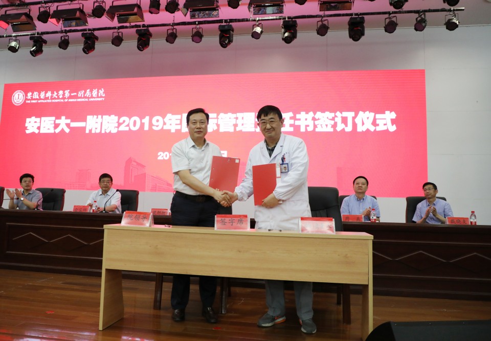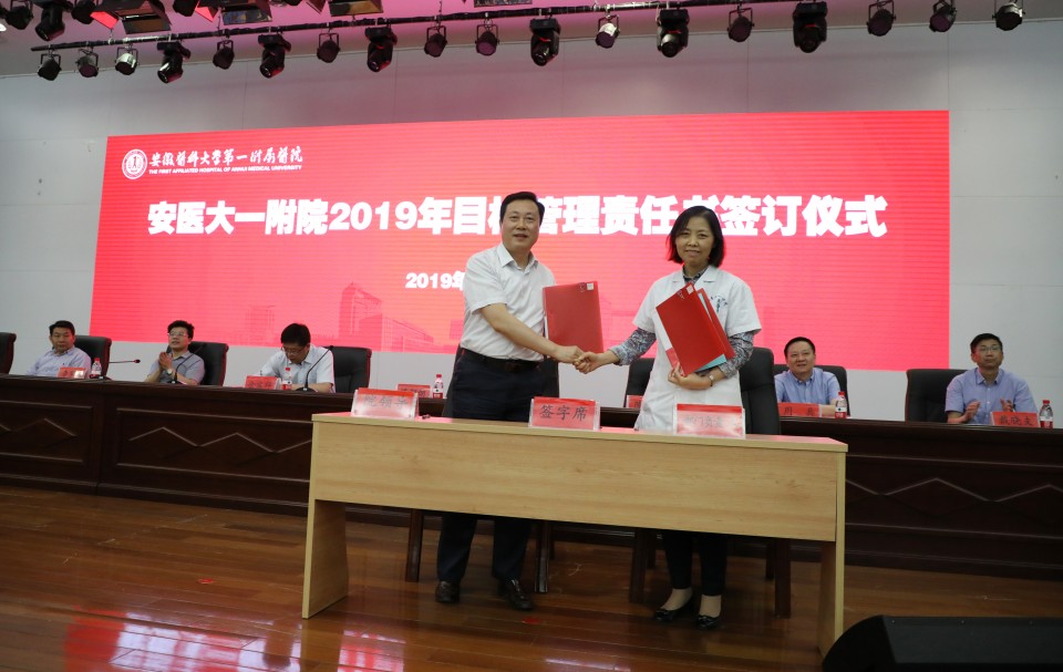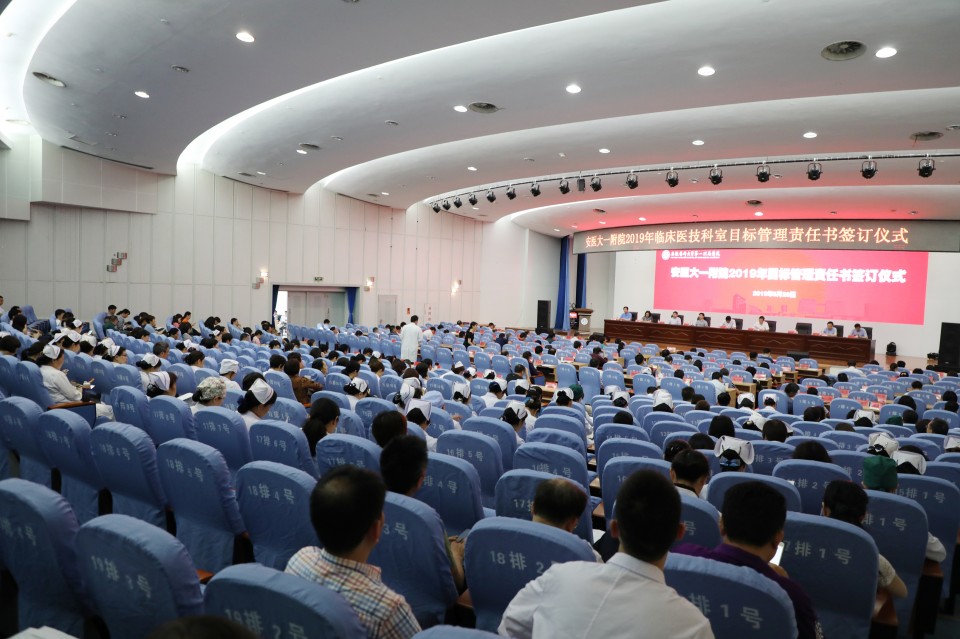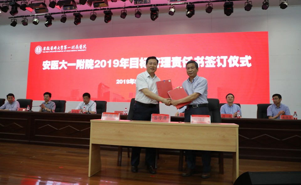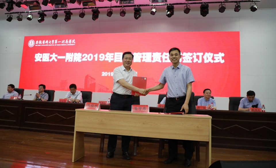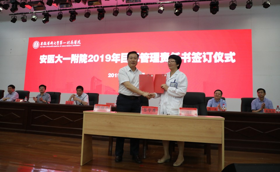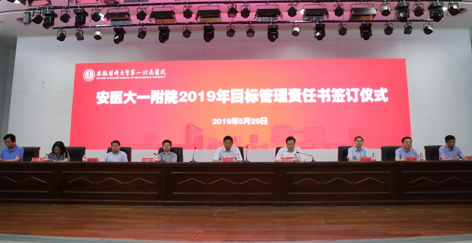 5月29日下午,医院在会议中心举办2019年临床医技科室目标管理责任书签订仪式。院领导金宗祥、梁朝朝、李家斌、陈宏凯、费广鹤、周典、王珩、戴晓支、孙国平出席会议。会上党委书记金宗祥作目标考核总结讲话,院长梁朝朝作工作总结及2019年目标考核工作动员讲话,并与临床医技科室代表签订了目标管理责任书。会议由常务副院长李家斌主持。