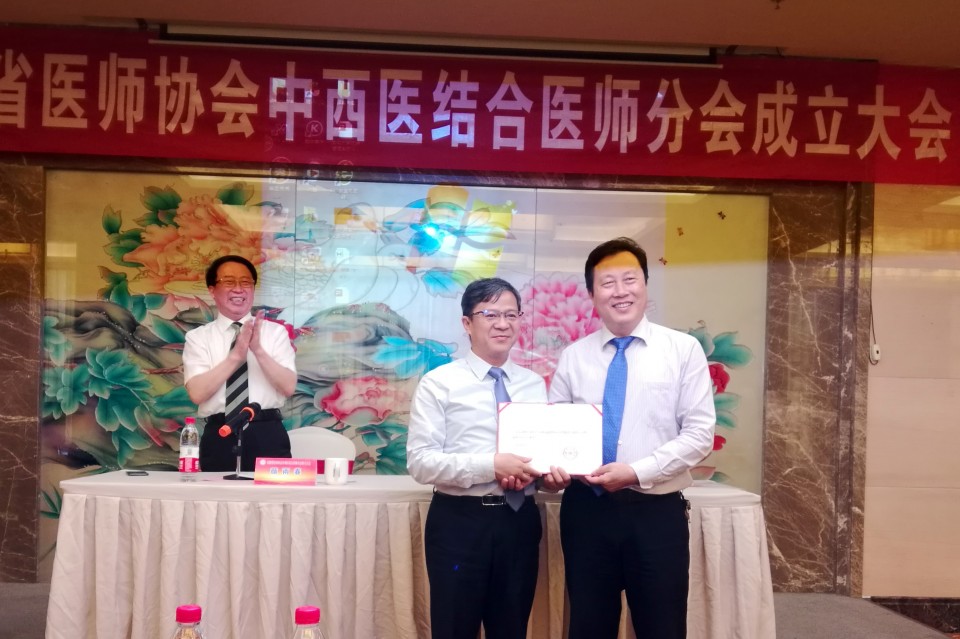 会议推选我院孙业祥教授担任中西医结合医师分会第一届主任委员。省医师协会会长梁朝朝为孙业祥主委颁发证书。孙业祥主委表示,“一定恪尽职守,广泛团结中、西医的同道,集思广益、发奋图强,努力把中西医结合医师分会维护好、建设好、发展好,不辜负大家的重托。”梁朝朝会长代表省医师协会就分会的责任义务、规范、学术交流与发展等方面发表了讲话。